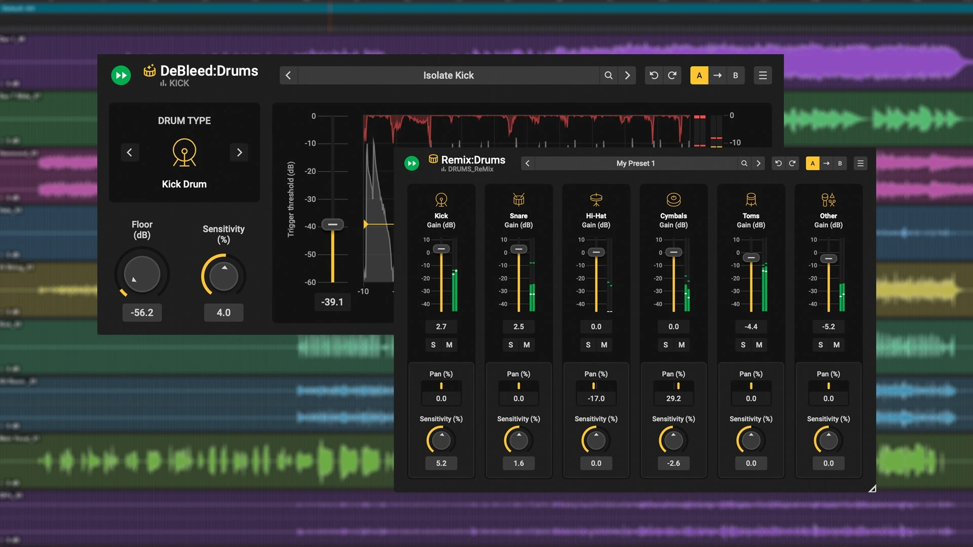 Diseñado para mejorar la claridad y optimizar el proceso de mezcla, DeBleed:Drums utiliza redes neuronales para separar los elementos de la batería, mientras que los algoritmos DSP mantienen la claridad transitoria. Su lógica de disparo inteligente elimina eficazmente el derrame, lo que resulta en una mezcla de batería más limpia y natural.