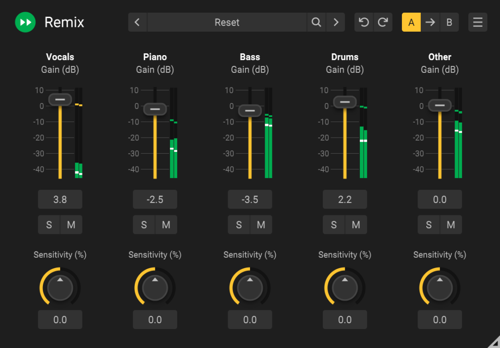 - Control de sensibilidad: ajuste la sensibilidad de detección de cada stem para lograr el equilibrio perfecto entre eliminación de artefactos y derrames.