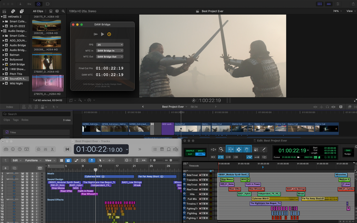 Cowan explica: “Uno de los mayores puntos débiles que tienen los editores de video es que actualmente no hay una mesa de mezclas en Final Cut Pro, ni la capacidad de agregar fundidos, canales auxiliares, instrumentos o cualquier otra cosa que pueda ofrecer un DAW. DAW Bridge permite que todas las estaciones de trabajo de audio digital profesionales funcionen sincronizadas con Final Cut Pro. Esto hace que los programas separados funcionen como una sola entidad, por lo que los creativos ahora pueden limpiar el sonido de producción, calificar proyectos completos, agregar pistas musicales, mezclar y entregar sin tener que salir de su editor de video. Es súper genial”.