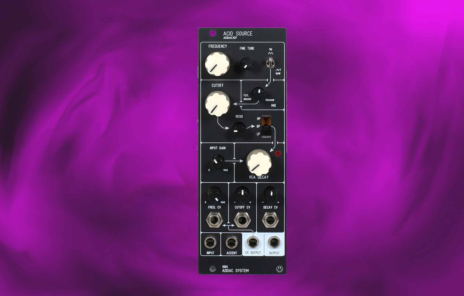 ADDAC System anuncia su último módulo Eurorack, ADDAC107 Acid Source. Acid Source, una voz de sintetizador compacta que incorpora funciones completas de VCO, VCF y VCA, incursiona profundamente en el territorio del sonido ácido con sonidos clásicos ‘squelchy’, todos los cuales pueden moldearse utilizando sus filtros paso bajo, paso de banda y paso alto incorporados. Ya sea que se use para una línea de bajo valiente, una línea de sintetizador principal sofocante o una percusión áspera, ADDAC107 ofrece sonidos ácidos épicos a raudales.