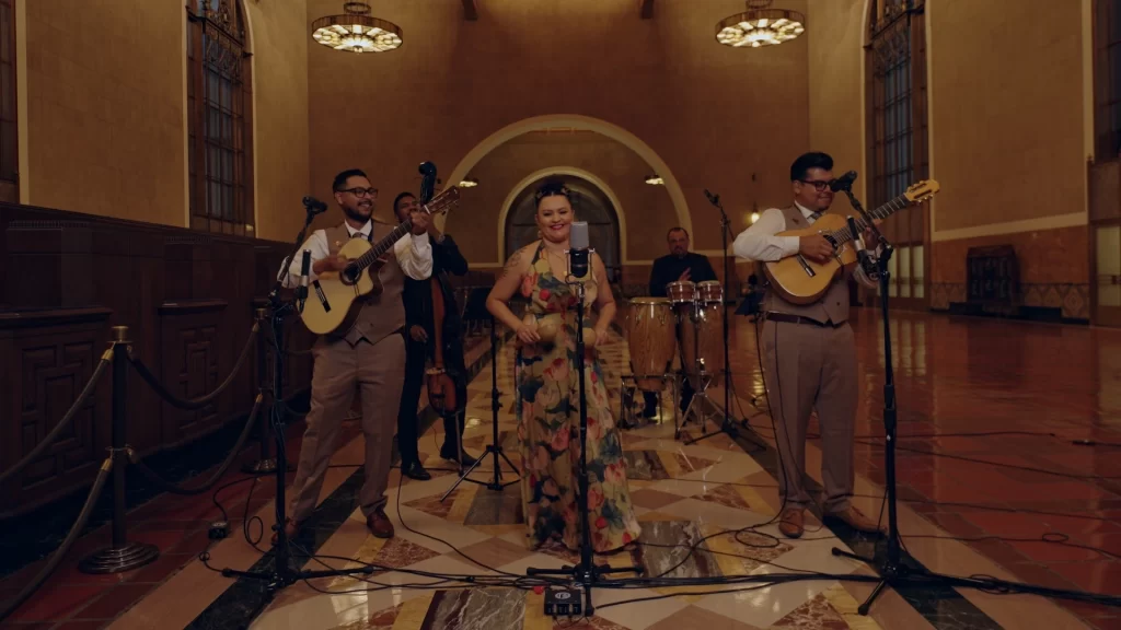 En colaboración con LA Metro, Boleros With Attitude y AEA Microphones presentaron un concierto en vivo en el vestíbulo de Union Station, el centro de transporte Art Déco de 1939 y un ícono de la historia de Los Ángeles. Para Martínez, tocar allí tenía una simetría natural. El lugar, la música y los instrumentos compartían raíces en la misma época.