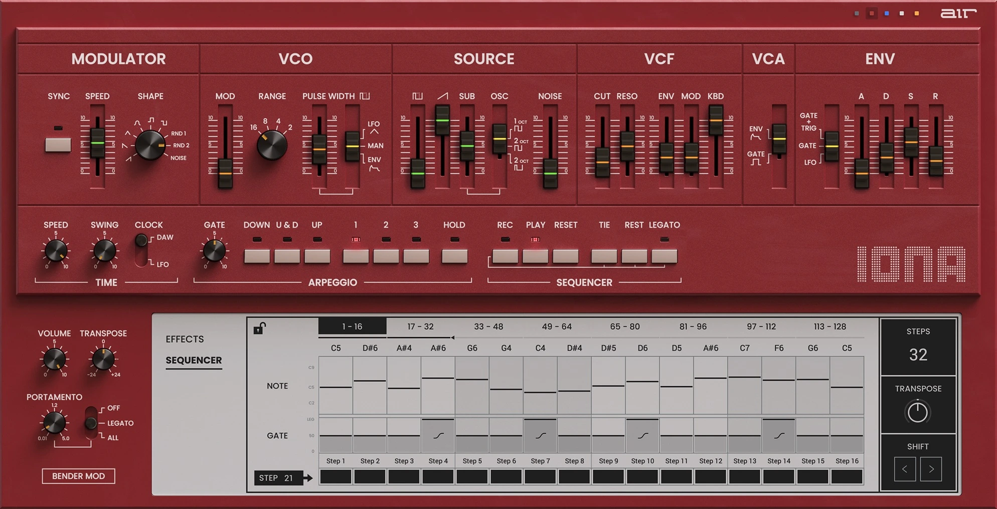 La arquitectura de síntesis de Iona recrea fielmente el sonido legendario del SH-101 mediante secciones de oscilador modeladas detalladamente, que incluyen fuentes de pulso, diente de sierra, subwoofer y ruido con rango de tono VCO original y controles de modulación. El instrumento cuenta con modulación por ancho de pulso mediante LFO, envolvente o control manual; un LFO sincronizable con BPM con nueve formas de onda y el clásico filtro resonante con envolvente, LFO y seguimiento de teclado. Una envolvente ADSR, portamento y un pitch bender personalizable completan la auténtica experiencia de interpretación.
