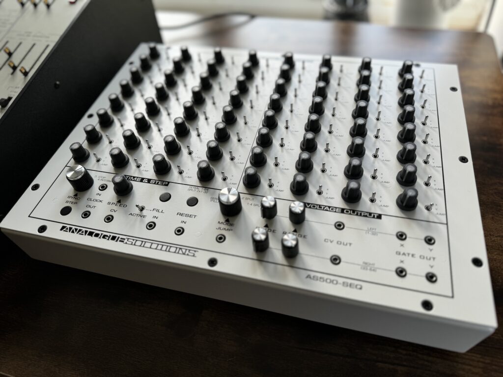 Como secuenciador analógico independiente, cada uno de los 64 pasos del AS500-SEQ tiene su propio control de nivel de CV, aunque estos no están cuantificados ya que, a diferencia de Megacity, el AS500–SEQ es un dispositivo puramente analógico, lo que significa que esta vez no tiene conectividad MIDI. También hay interruptores de palanca para la funcionalidad X, Y y JUMP por paso, que seleccionan si se enviará un trigguer a los conectores mini-jack de 3,5 mm GATE OUT X o GATE OUT Y, o si la orden SEQUENCER “saltará” al inicio de la siguiente columna a la derecha o, alternativamente, “saltará” al primer paso de la primera columna (si se presiona el botón RESET al mismo tiempo).