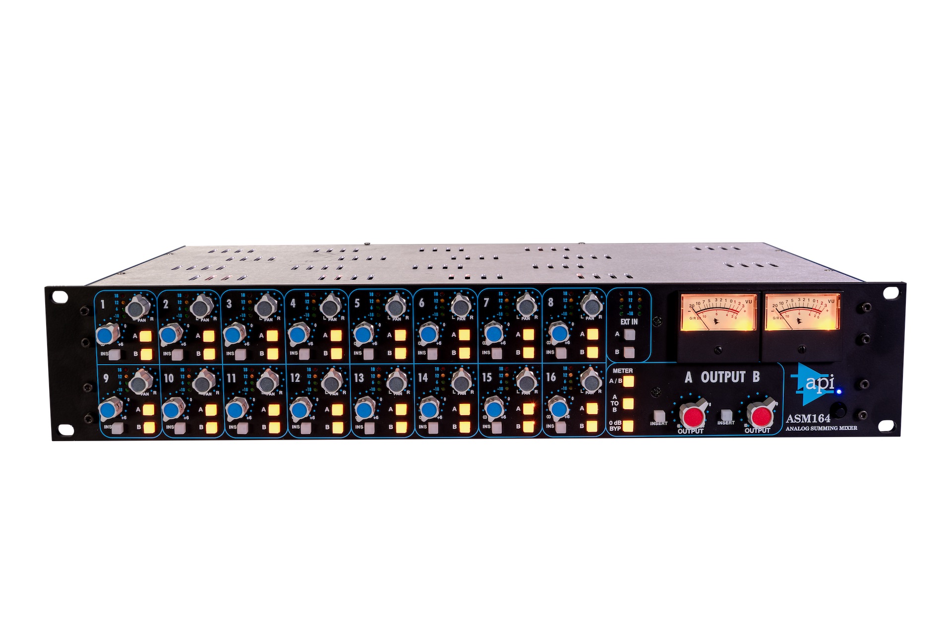 Basándose en la rica herencia de API de consolas de grabación de altísima calidad, la compañía presenta el ASM164, un mixer analógico de 16 canales que ofrece el rendimiento sumador de API en un práctico formato de rack de 19 pulgadas. Con un diseño basado en la sección sumadora de la consola THE BOX®, el ASM164 está diseñado para estudios de proyectos profesionales, estudios caseros e instalaciones de producción de todo tipo. El ASM164 está diseñado para proporcionar el legendario sonido API en un paquete eficiente y rentable. Las especificaciones incluyen: