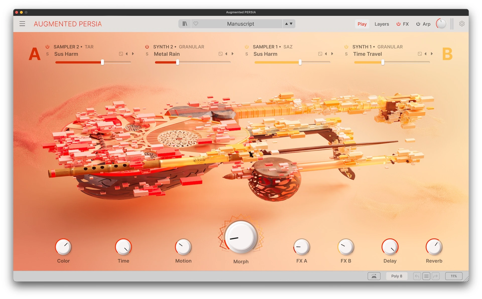 Augmented PERSIA explora una paleta musical distintiva de Persia y Oriente Medio, reinventada mediante un flujo de trabajo híbrido moderno. Con 6 instrumentos muestreados en profundidad, articulaciones expresivas y la arquitectura de síntesis multicapa de Augmented, transita con fluidez desde timbres acústicos tradicionales hasta movimiento cinematográfico, texturas abstractas y diseño de sonido contemporáneo.