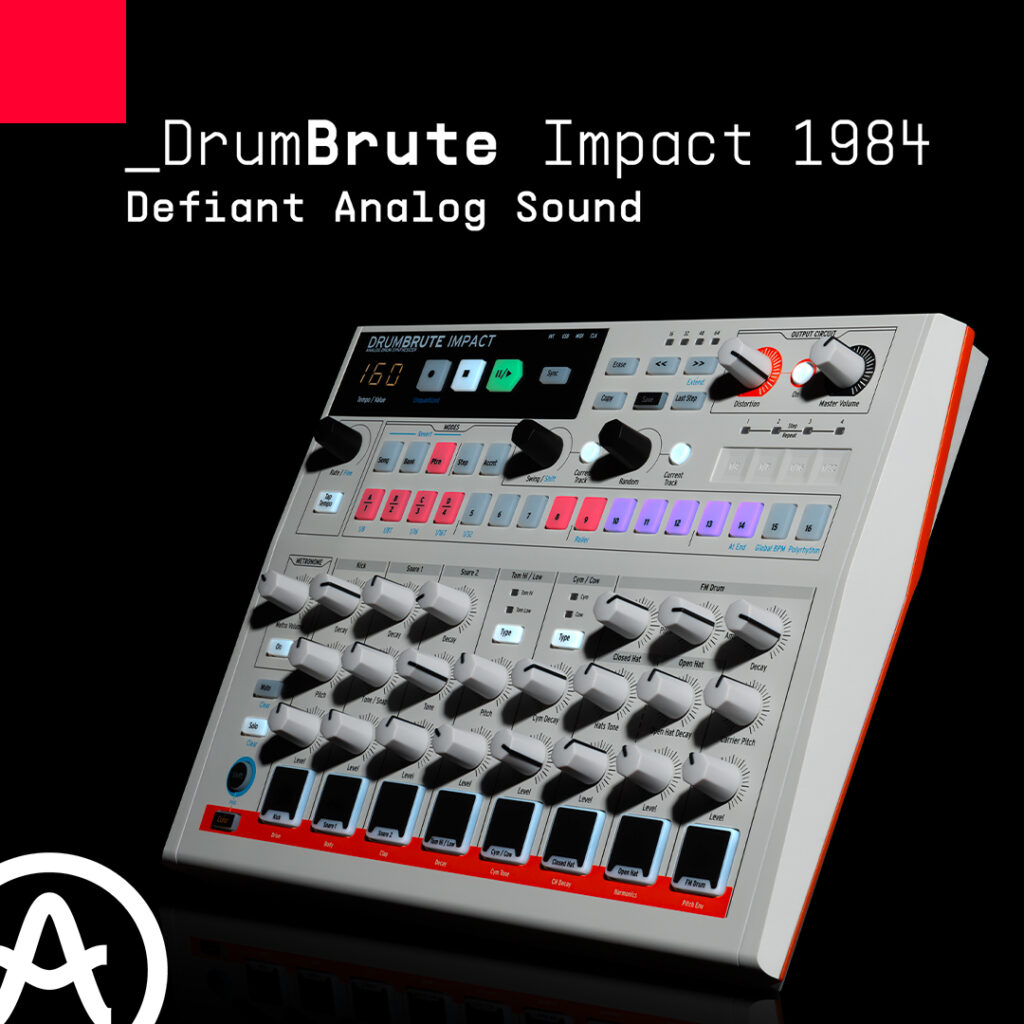 DrumBrute Impact 1984 es una caja de ritmos para músicos exigentes que anhelan potencia cruda y un tono monstruoso. Ajusta el color, aumenta la distorsión, lleva los polirritmos más allá que nunca. ¿Estás listo para causar impacto?