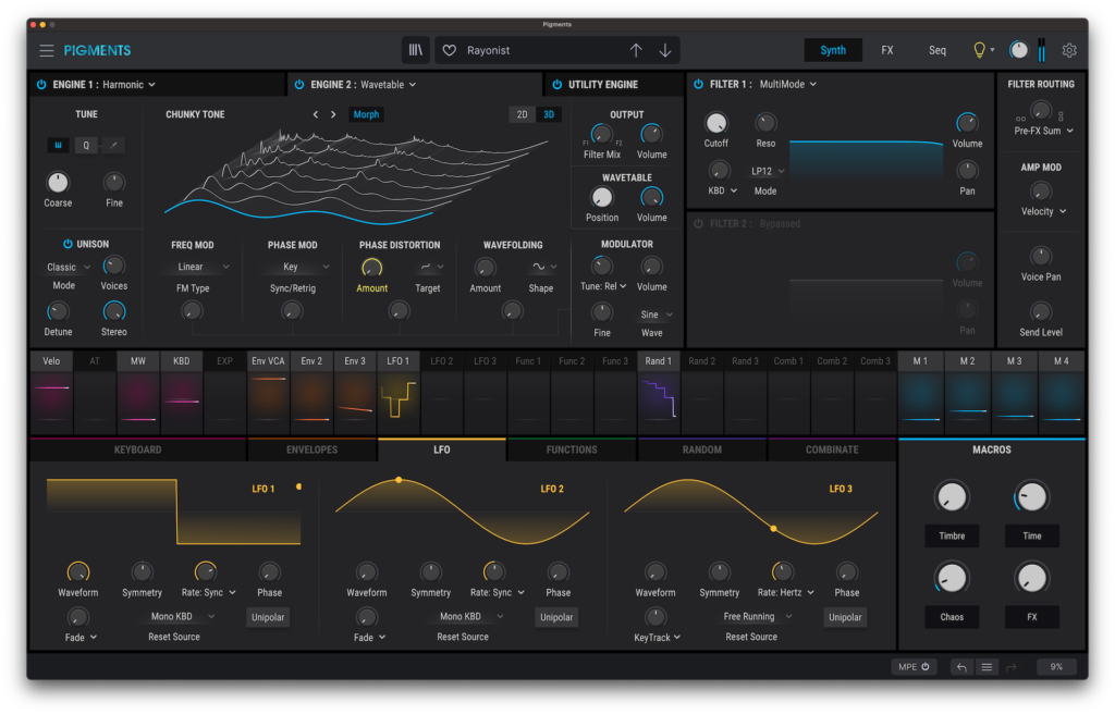 - 3rd Utility engine: agregue una capa de oscilador adicional y hasta 2 capas de muestra de ruido al sonido de doble motor de Pigments para obtener una profundidad adicional y un color sónico