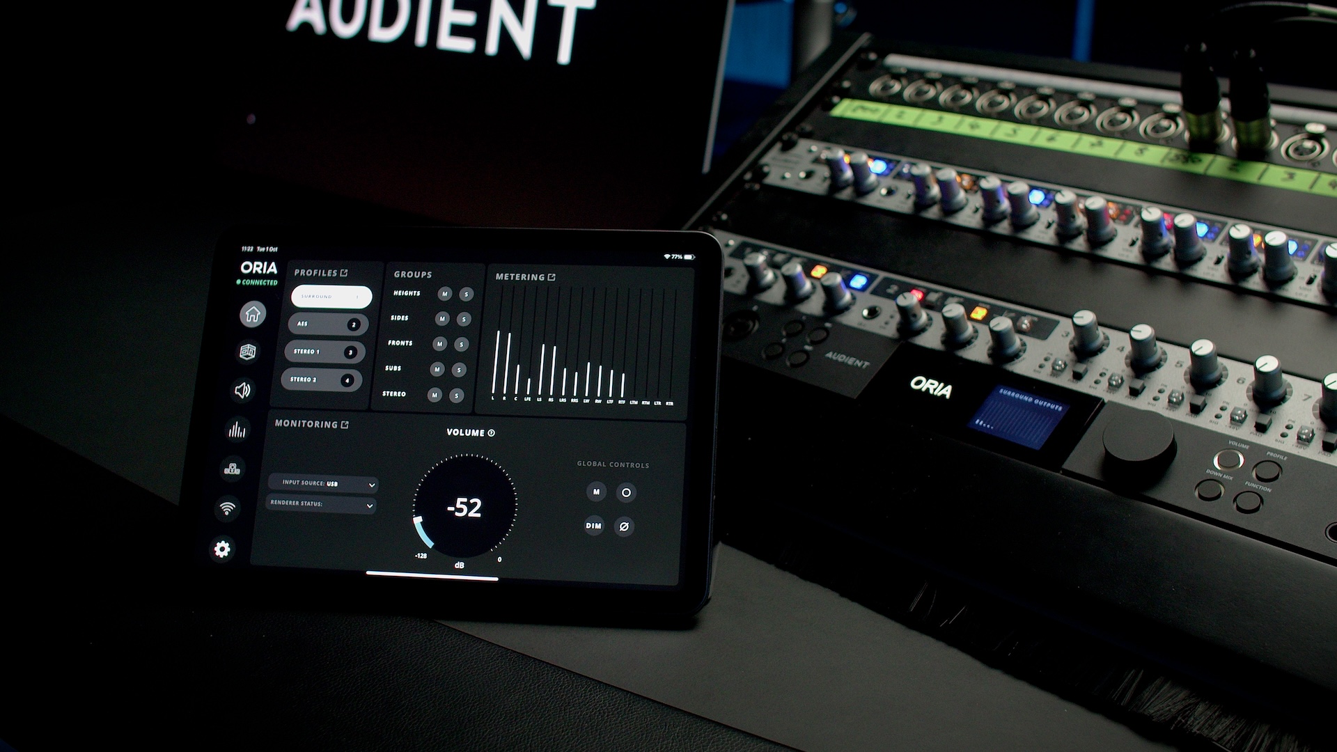 La aplicación para iPad es completamente gratuita y permite al usuario controlar ORIA de forma remota, directamente desde el iPad. Diseñada para acelerar el flujo de trabajo, Andrew Allen de Audient explica: “La pestaña de inicio de la aplicación es esencialmente el centro de comando definitivo para ORIA, que le otorga un acceso rápido a todas las funciones de monitoreo clave de ORIA en una sola pantalla, sin la necesidad de alcanzar el rack”.
