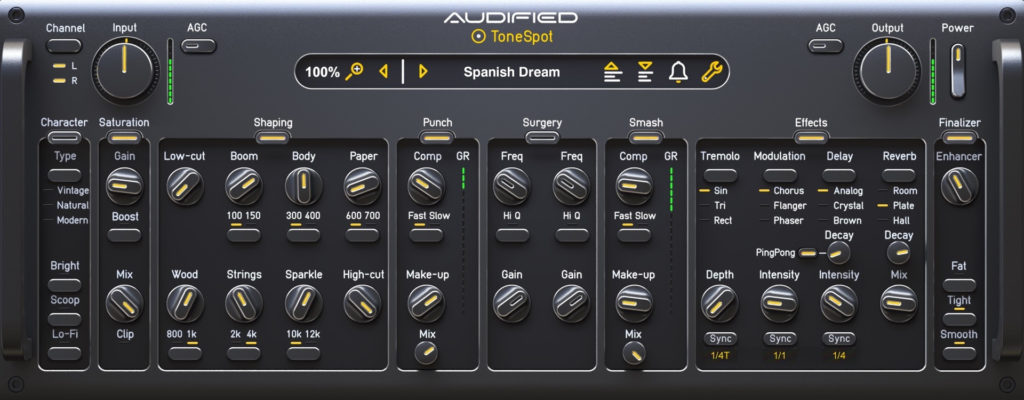 Tal vez las imágenes puedan pintar mil palabras. Sin embargo, cuando se trata de ToneSpot Acoustic Pro, los controles con significado musical: Character (Tipo, Brillante, Scoop, Lo-Fi), Saturación (Ganancia, Refuerzo, Mezcla), Modelado (Low cut, Boom 100/150, Cuerpo 300) / 400, Papel 600/700, Madera 800 / 1k, Cuerdas 2k / 4k, Sparkle 10k / 12k, High cut), Punch (Compresión Rápida / Lenta, Maquillaje, Mezcla), Cirugía (Freq Hi Q, Ganancia) , Smash (Comp Rápido / Lento, Maquillaje, Mezcla), Efectos (Tremolo Sin / Tri / Rect, Modulation Chorus / Flanger / Phaser, Delay Analog / Crystal / Brown, Reverb Room / Plate / Hall – con Decay / Ping Pong, Profundidad, Intensidad, Mezcla, Sincronización) y Finalizer (Enhancer, Fat, Tight, Smooth) están organizados en su impresionante GUI fácil de usar, iniciando un fácil acceso a consejos, trucos y herramientas profesionales con procesadores, y un amplio conoce-cómo, al mismo tiempo que fomenta la experimentación.