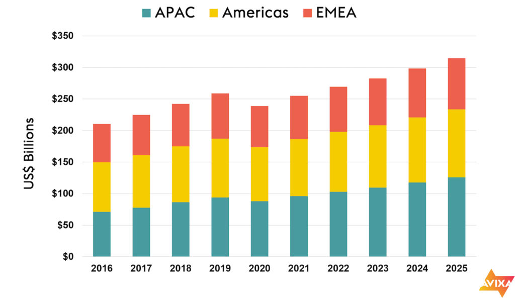 Asia-Pacifico tendrá el mayor crecimiento de todas las regiones, con una tasa compuesta anual de 7.4%, desde 2020 hasta 2025, en comparación con el 4.7% para América y el 4.5% por ciento para Europa, Medio Oriente y África (EMEA). En 2025, los ingresos de la industria AV de Asia-Pacifico ascenderán a 126 mil millones de dólares, en comparación con 108 mil millones para América y 81 mil millones para EMEA.