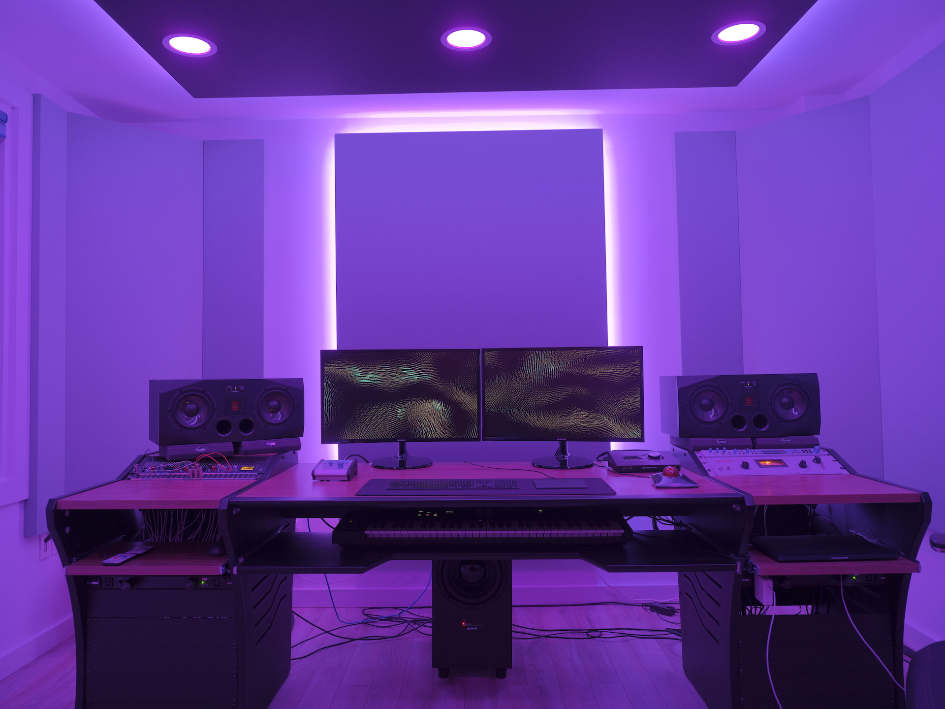 AVN tomó medidas, diseñó los paneles acústicos, especificó varias mesas, integró el equipo del estudio, suministró las instalaciones de superficie para las salas de control terminadas y continúa apoyando las necesidades técnicas de Swag Studios. También hicieron sugerencias para la apariencia estética y los colores de la tela: Swag Studios eligió paneles de tratamiento grises, retroiluminados con LED que cambian de color, extraíbles violetas y difusores azules, y pronto recibirán los monitores SymphonicAcoustics Dual 8 con 12 subs individuales.