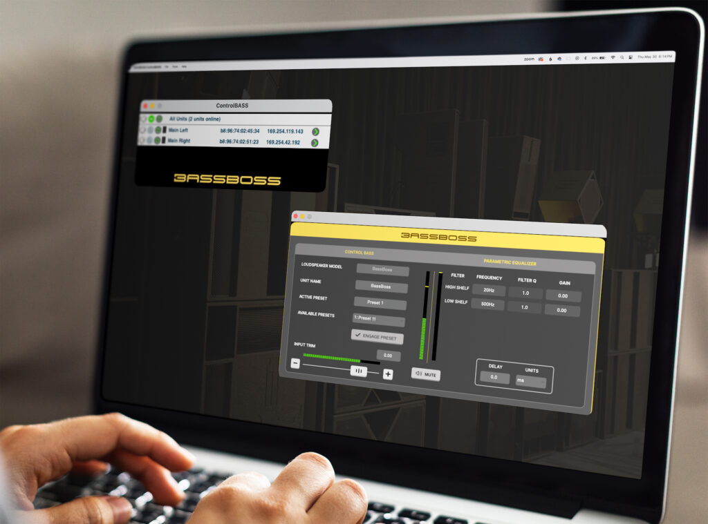 El control remoto significa que los operadores de BASSBOSS tienen control de los niveles sin tener que agregar ningún otro equipo en la ruta de la señal. También significa que el ajuste del sistema se puede realizar desde cualquier lugar donde se pueda transportar una computadora portátil, no solo detrás de una consola o en la parte posterior de un altavoz.