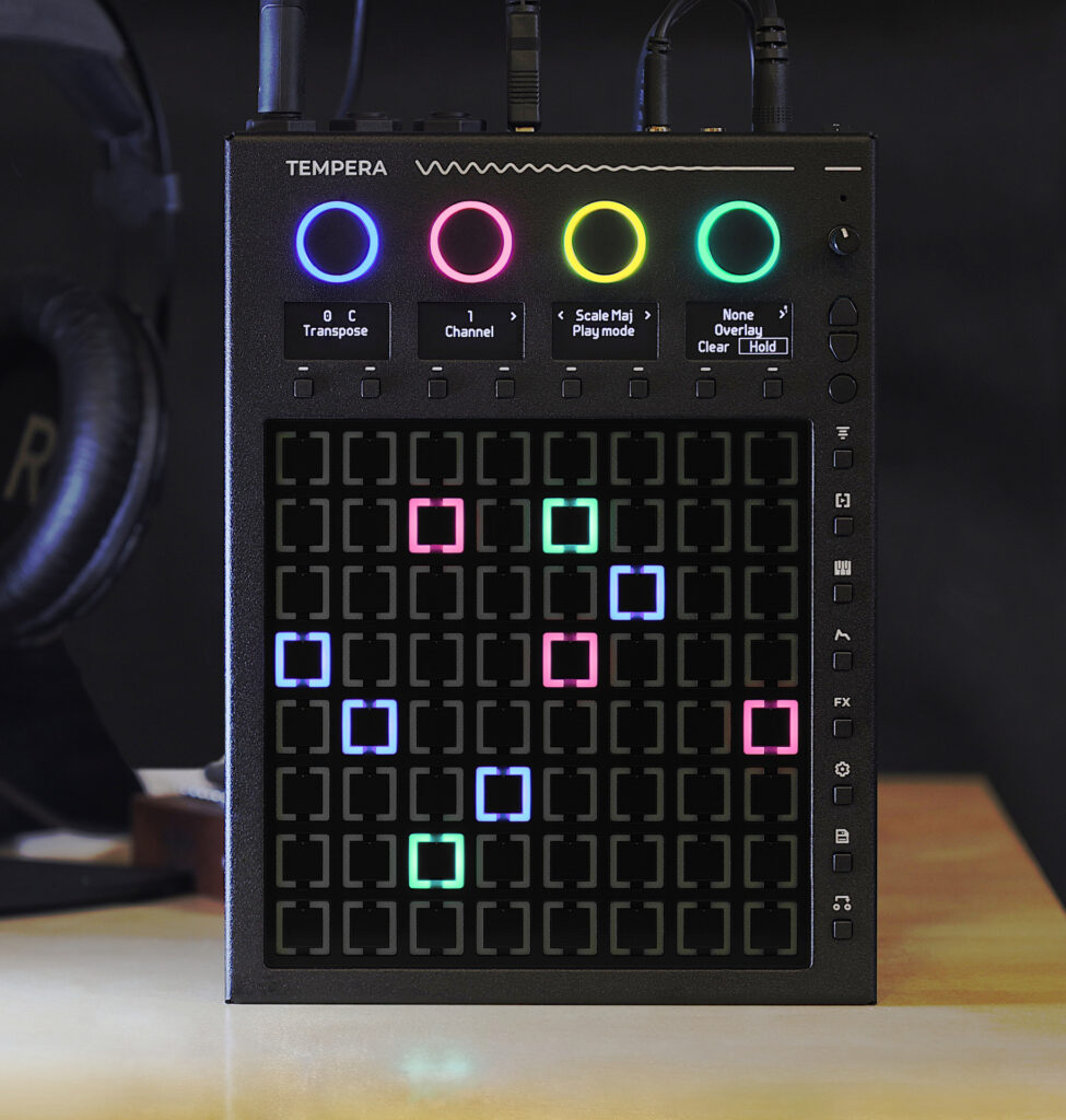 Como sintetizador granular polifónico de 16 voces y múltiples muestras que permite enfoques prácticos tanto para la interpretación en vivo como para el diseño de sonido, Tempera invita a sus usuarios a combinar tonos con un procesamiento de audio impecable. Tempera bien podría considerarse como ocho pistas de cinta estéreo paralelas que están dispuestas una al lado de la otra en columnas para formar una especie de superficie de cinta 2D, con los dedos convirtiéndose en “generadores” de uno o más “cabezales de cinta”. Dicha superficie es en realidad una interfaz de control sensible al tacto totalmente polifónica (TouchGrid) sobre la cual se colocan los emisores, que a su vez producen corrientes de granos. En otras palabras, ocho muestras de audio están dispuestas en esas columnas, lo que da como resultado miles de granos que viajan a través de la superficie para crear ritmos cortados, delicadas nubes de granos, dramáticas partituras orquestales y exuberantes paisajes sonoros. El potente motor granular de Tempera puede producir dispersiones, loops, movimientos y ritmos organizados caóticos.