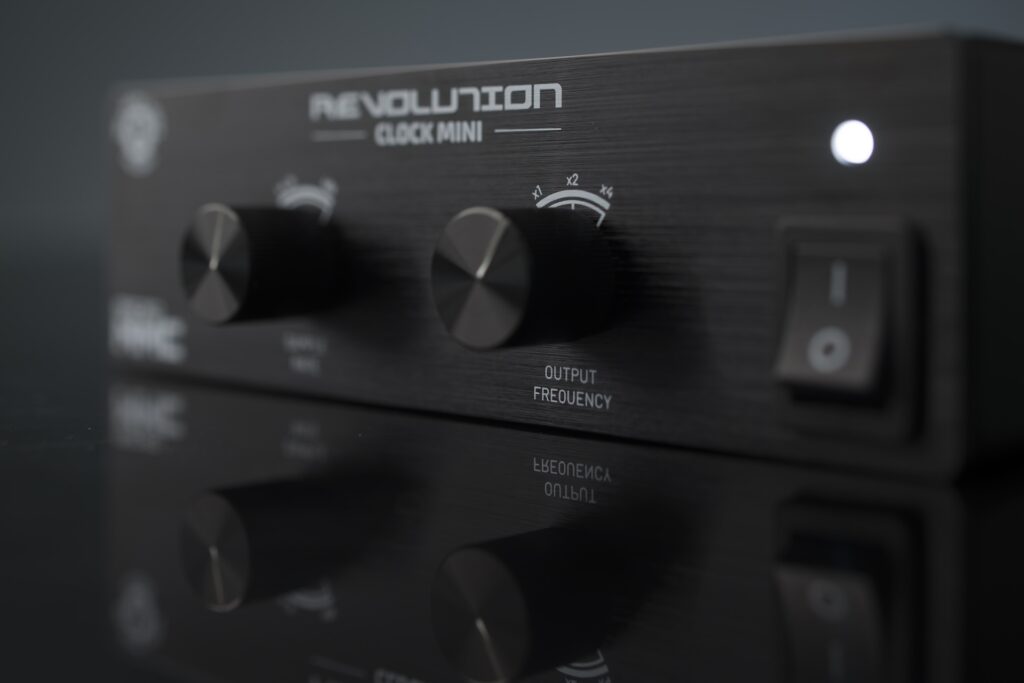 - Revolution Clock Mini: una solución compacta pero potente para estudios más pequeños o uso en vivo, que ofrece 3 salidas BNC y una sincronización sólida como una roca de hasta 192kHz.