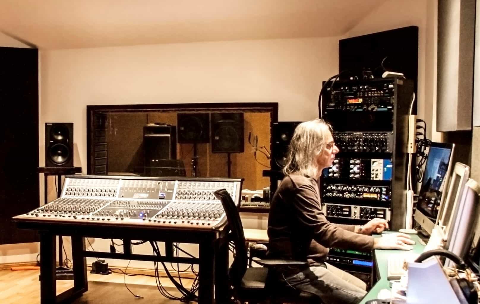 La plataforma móvil de Hawkins en el estudio “hecha en los setenta” está repleta de preamplificadores y compresores de audio…