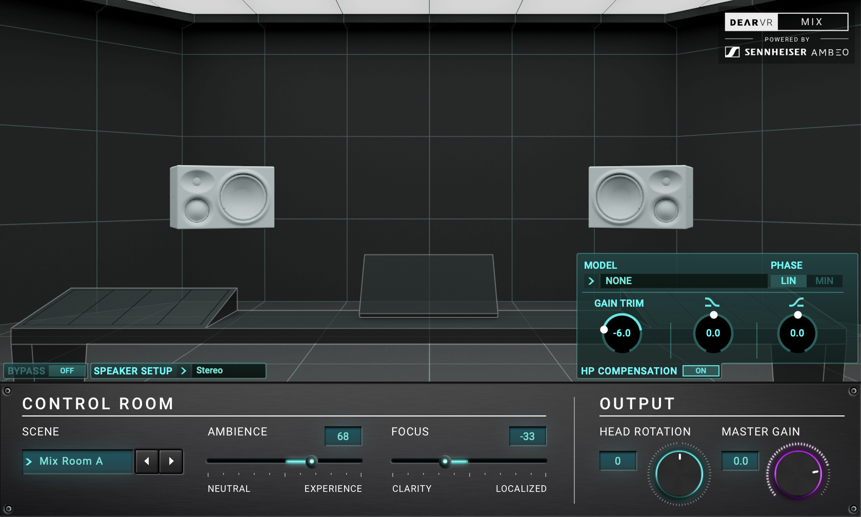 El plugin ofrece tres salas de mezcla de referencia de clase mundial con cuatro posiciones de monitores mono y estéreo seleccionables. Además, cada sala de mezcla se puede adaptar al gusto del usuario controlando la cantidad de difusión y estableciendo el equilibrio perfecto entre la coloración general y la localización según el algoritmo Clarity patentado de Sennheiser AMBEO.