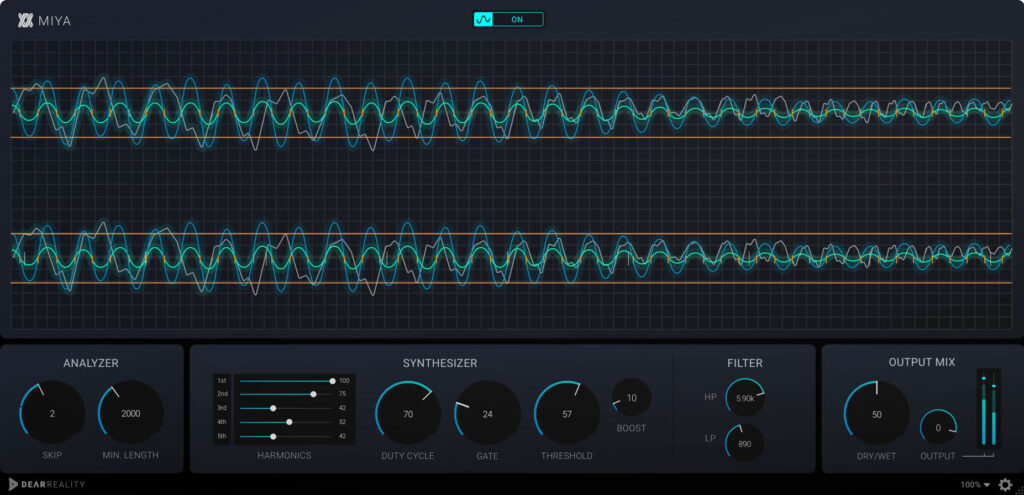 A diferencia de los efectos de distorsión ordinarios, MIYA procesa la entrada original detectando cruces por cero y reemplazando la señal original entre ellos con formas de onda sintetizadas de forma aditiva. “Somos especialistas en audio espacial, pero también nos apasionan los algoritmos de audio emocionantes fuera de nuestro enfoque de audio espacial”, explica Felix Lau, propietario de producto de Dear Reality. “Un ejemplo perfecto de esto es la tecnología de distorsión digital única de MIYA, en la que el oyente puede reconocer tanto la huella del sonido original como la del sintetizado”.