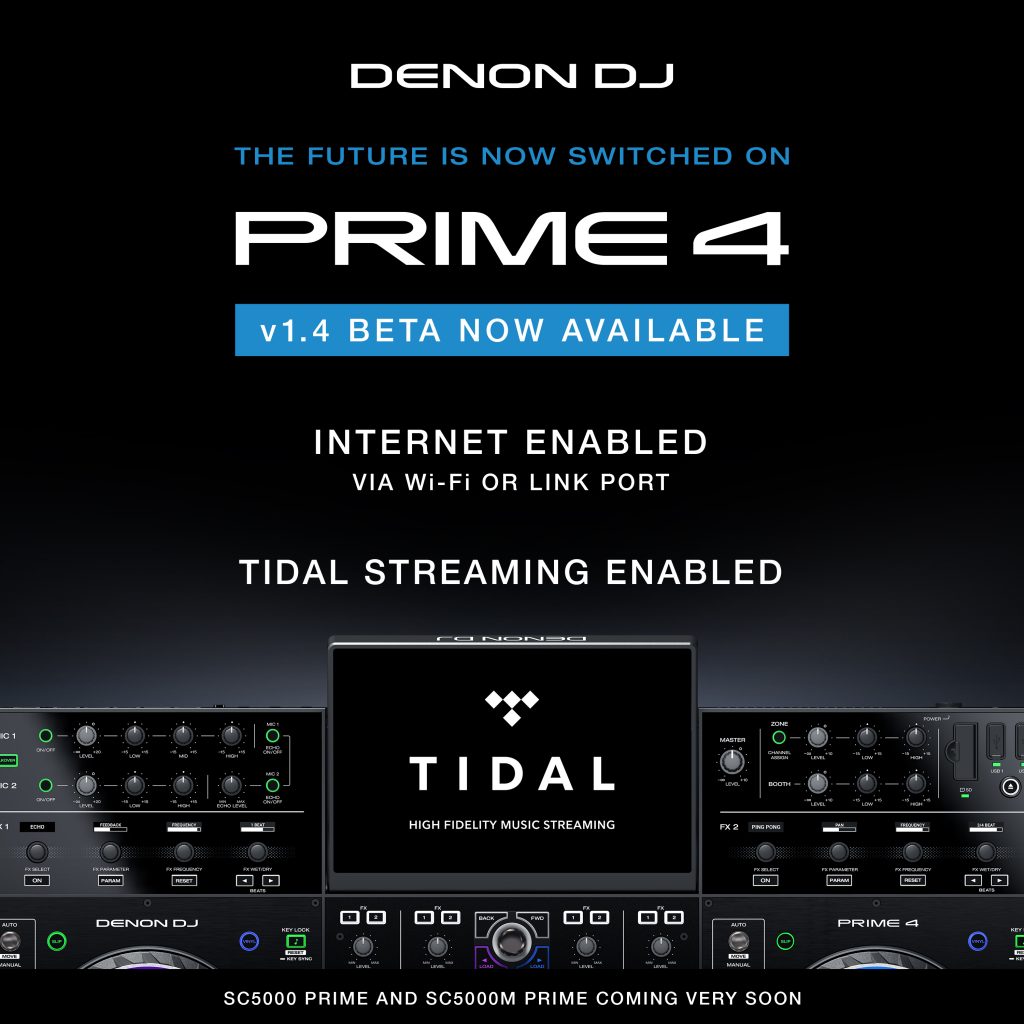 Denon DJ (www.denondj.com), un fabricante líder de productos y soluciones de DJ premium, anunció hoy que su controlador inteligente Prime 4 ahora está habilitado tanto para cableado como para conexión Wi-Fi a internet, a través de una nueva actualización de firmware v1.4. Esta actualización, entregada dentro de una iniciativa beta pública basada en el foro, trae la plataforma global de streaming y entretenimiento TIDAL, la primera de los socios de streaming de contenido premium de Denon DJ, a Prime 4, con soporte SC5000 y SC5000M en breve. Tanto los miembros del grupo beta como los usuarios actuales de Prime Series (después del registro del producto en denondj.com) recibirán un período de prueba TIDAL HiFi de 3 meses gratis.