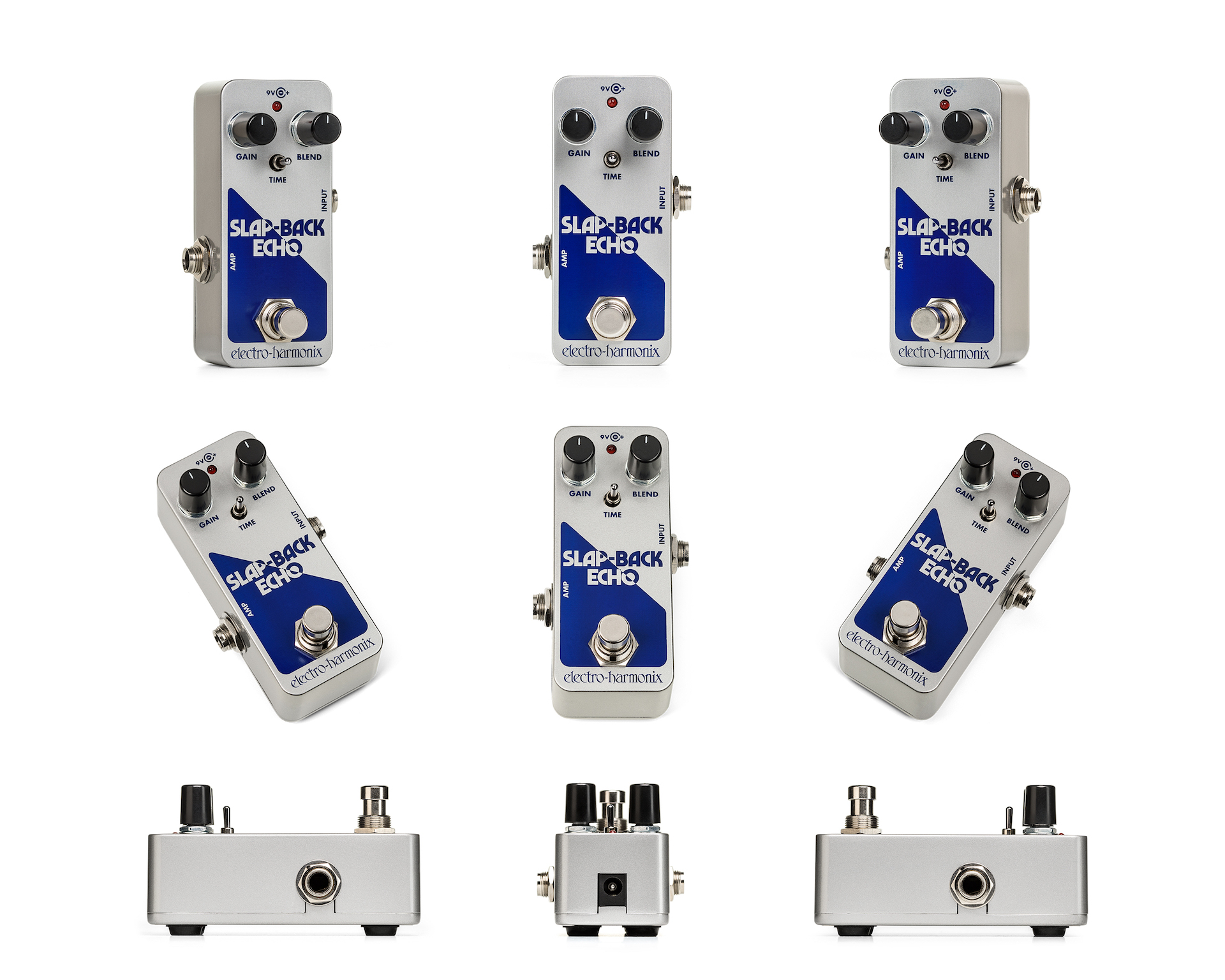 Alojado en el chasis tamaño Pico de EHX, el Slap-Back Echo totalmente analógico presenta perillas de ganancia y mezcla, así como un interruptor de tiempo. La perilla de ganancia controla la señal de entrada antes del circuito de eco y también ajusta el volumen general en la salida con un impulso de hasta +20dB. La perilla Blend mezcla la señal seca y la señal de eco de 100% seca a 100% de eco. El interruptor de tiempo selecciona entre tres tiempos de delay diferentes: 45ms, 65ms y 100ms.