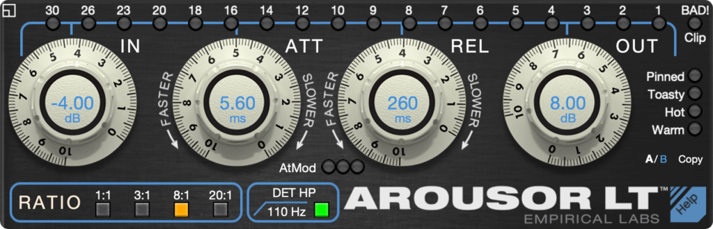 Con AROUSOR LT™, ELI redujo efectivamente el tamaño de AROUSOR™ simplificando sus controles, ocultando algunas funciones y ajustando su enfoque de 12 configuraciones de RATIO variadas a cuatro cuidadosamente seleccionadas que brindan un equilibrio perfecto entre versatilidad y facilidad de uso: 1:1: sin compresión, lo que permite utilizarlo con una capacidad de saturación de sonido suave sin compresión; 3:1: una curva de compresión suave con un knee de 10 a 30dB, dependiendo de los ajustes ATT (ataque) y REL (liberación); 8:1: la misma proporción y curva que la popular configuración 6:1 del hardware Distressor y una proporción más agresiva que solo funciona en cualquier instrumento o pista vocal; y 20:1: otra relación favorita para fines reducir picos o para crear ambientes naturales cuando se usa mucho con micrófonos de sala o fuentes de sonido seco y sin vida, gracias al ataque más lento que suaviza el sonido “grabby”.