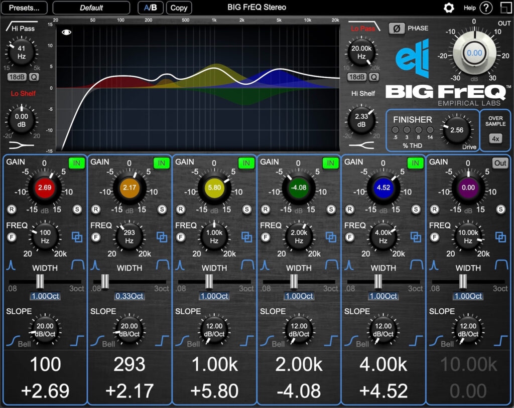 Pero lo mejor de todo es que BIG FrEQ es inmensamente útil, obviamente, ya que ofrece la capacidad de crear modernas curvas de ecualización ‘plana’ con un flujo de trabajo analógico y controles adicionales para más posibilidades de modelado de tono que un plug-in de EQ típico. Póngalo de esta manera: cada una de las seis bandas paramétricas tiene un control SLOPE adicional que permite aplanar la forma del ecualizador y capturar más frecuencias por igual, mientras que activar la función de enfoque (F) permite a los usuarios ajustar con precisión el ajuste de frecuencia, centrando la frecuencia seleccionada y reduciendo el rango de la perilla FREQ para escuchar exactamente qué frecuencias se ven afectadas con los botones solo (S) conmutables simultáneamente disponibles en cada banda paramétrica. En otros lugares, la perilla GAIN de cada sección paramétrica se puede expandir de ± 15dB a ± 30dB con el botón de rango (R), mientras que la configuración de la sección paramétrica se puede copiar y pegar de forma única de una a otra para mover y duplicar bandas rápidamente, facilitando una operación más rápida. Además de eso, la exclusiva sección FINISHER agrega calidez a cualquier pista con saturación orgánica y proporciona un sobremuestreo de hasta 8x (probado hasta una operación de 768 kHz).