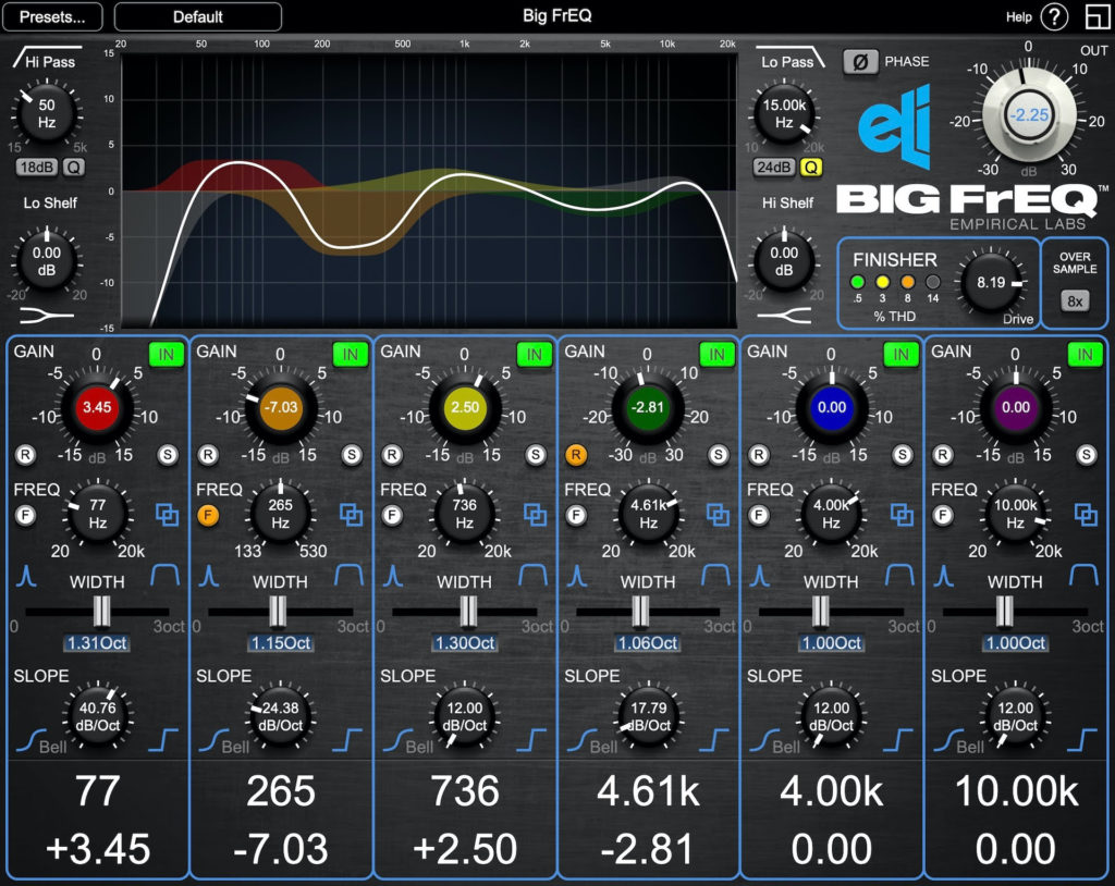 Pero lo mejor de todo es que BIG FrEQ es inmensamente útil, obviamente, ya que ofrece la capacidad de crear modernas curvas de ecualización ‘plana’ con un flujo de trabajo analógico y controles adicionales para más posibilidades de modelado de tono que un plug-in de EQ típico. Póngalo de esta manera: cada una de las seis bandas paramétricas tiene un control SLOPE adicional que permite aplanar la forma del ecualizador y capturar más frecuencias por igual, mientras que activar la función de enfoque (F) permite a los usuarios ajustar con precisión el ajuste de frecuencia, centrando la frecuencia seleccionada y reduciendo el rango de la perilla FREQ para escuchar exactamente qué frecuencias se ven afectadas con los botones solo (S) conmutables simultáneamente disponibles en cada banda paramétrica. En otros lugares, la perilla GAIN de cada sección paramétrica se puede expandir de ± 15dB a ± 30dB con el botón de rango (R), mientras que la configuración de la sección paramétrica se puede copiar y pegar de forma única de una a otra para mover y duplicar bandas rápidamente, facilitando una operación más rápida. Además de eso, la exclusiva sección FINISHER agrega calidez a cualquier pista con saturación orgánica y proporciona un sobremuestreo de hasta 8x (probado hasta una operación de 768 kHz).