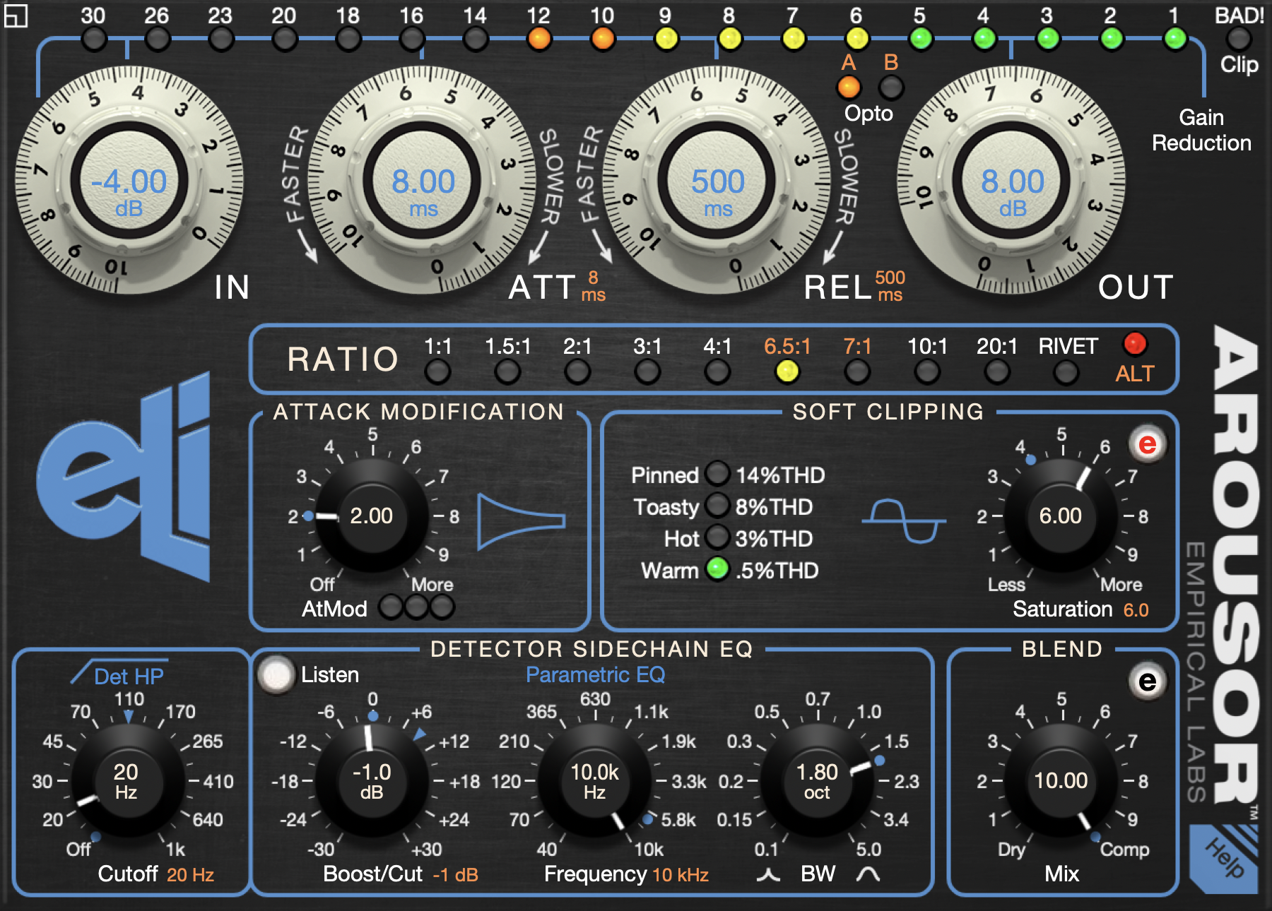 La compresión knee clásica de ELI con modelado de detector de alta resolución patentado permanece en el corazón de todo lo que AROUSOR™ Rev 3 hace tan bien, con 12 relaciones de compresión únicas, incluida la famosa pared de ladrillos, modo RIVET en AROUSOR™, para una máxima reducción de ganancia. Las características restantes que vale la pena destacar aquí son un control SOFT CLIPPING de banda ancha ajustable, para introducir una saturación cálida, un control AtMod ATTACK MODIFICATION único para cambiar la forma del ataque inicial, un avanzado DETECTOR SIDECHAIN EQ de paso alto/paso de banda para ajustar la respuesta del detector de compresión y la perilla Mix con Dry Level Trim para compresión paralela.