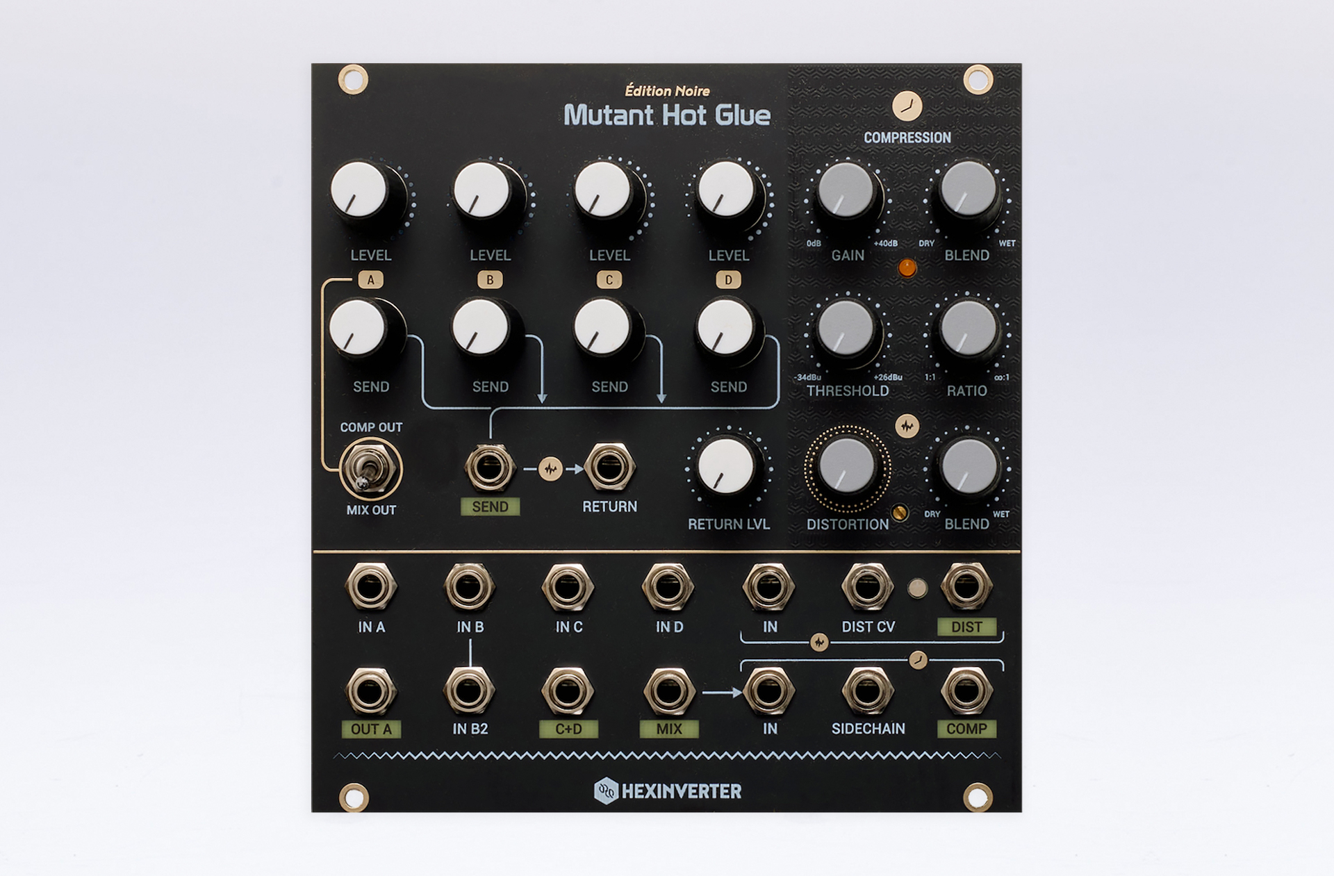 El Mutant Hot Glue es un mixer de bus versátil para el diseño de cadenas de efectos analógicos. El compresor analógico incluido ofrece compresión en serie o en paralelo y una entrada sidechain, lo que lo hace especialmente adecuado para el procesamiento de baterías. La distorsión controlada por voltaje se basa en ideas tomadas de los pedales de guitarra responsables de muchos de los sonidos techno de estilo ácido de ayer, pero mejoradas con respecto a los equivalentes de guitarra y hechas específicamente para el procesamiento de sintetizadores y baterías. La distorsión se puede utilizar en su posición predeterminada, normalizada al envío de efectos, o como cualquier otra parte del módulo, dividida y utilizada en otro lugar de un sistema modular.