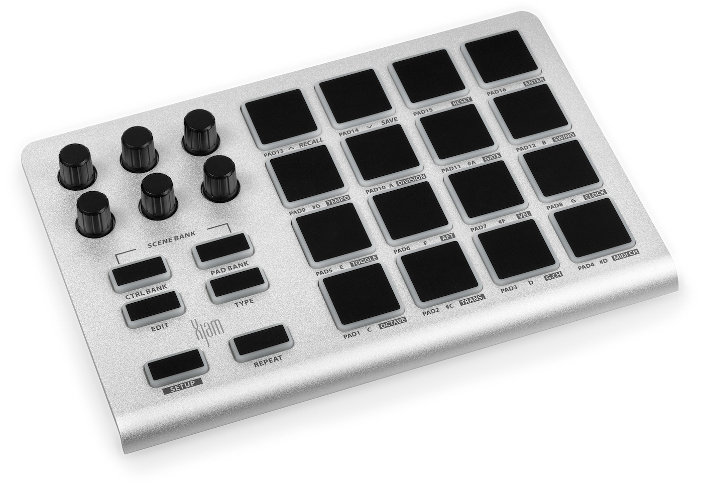 Xjam proporciona 16 pads RGB con aftertouch polifónico en una matriz de 4×4 más 6 codificadores sin fin que se pueden usar en 48 escenas de configuración. Prácticamente cualquier tipo de mensaje MIDI común se puede asignar a cada uno de estos controles y la edición se puede realizar rápida y directamente en el hardware. ESI también proporciona un poderoso software de edición para Mac, PC y iPad que ayuda a monitorear datos MIDI y configurar Xjam para las necesidades específicas de manera muy cómoda.