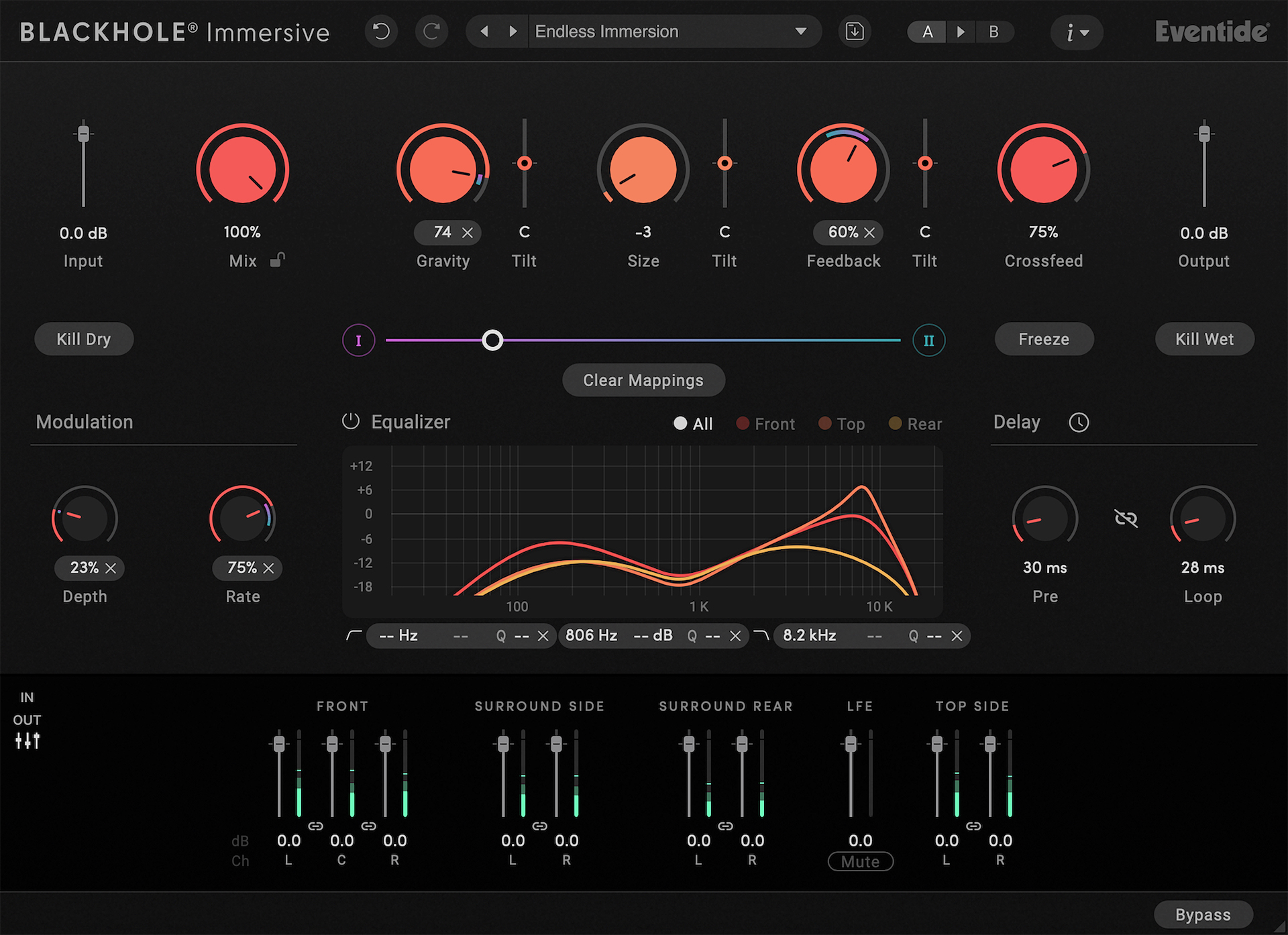 Utilizado como envío o inserción, Blackhole Immersive sigue siendo respetuoso pero reactivo al posicionamiento de la pista. Los parámetros de gravedad, tamaño y feedback de Blackhole Immersive permiten una adaptación rápida y sencilla de la reverberación a un espacio inmersivo, mientras que el control de alimentación cruzada permite a los usuarios combinar la reverberación entre los altavoces: una fuente mono puede volverse verdaderamente inmersiva con un simple gesto. “Blackhole Immersive toma mi reverberación favorita y la hace aún más vasta y sobrenatural”, dice el compositor y productor Matt Lange. “Una herramienta absolutamente imprescindible para una mezcla y producción inmersivas”.