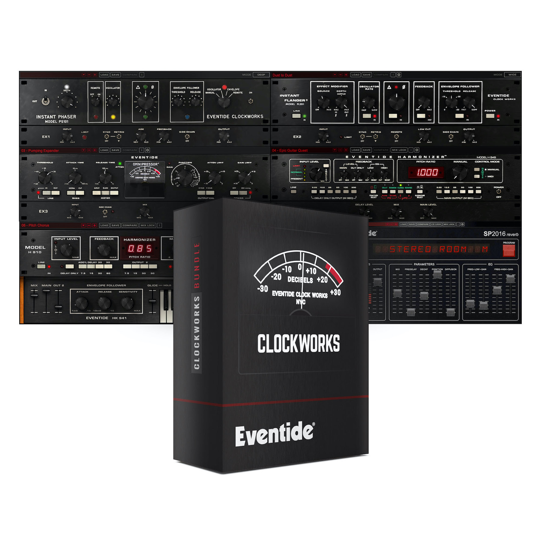 En 1971, en un sótano de la ciudad de Nueva York, Eventide Clockworks revolucionó la industria del audio al crear el primer procesador de efectos de estudio del mundo, Instant Phaser y el primer dispositivo digital de audio profesional, Digital Delay Line. En el transcurso de la década siguiente, Eventide continuó introduciendo nuevos paradigmas de procesamiento: el primer Harmonizer® del mundo, el H910, seguido del Omnipressor®, Instant Flanger, H949 y el SP2016. Meticulosamente modelado para producir con precisión estos efectos heredados, con versiones duales de H910 y H949, el paquete de plugins Eventide Clockworks también incluye funciones sónicas y compatibles con DAW incluso más allá de las capacidades del hardware.