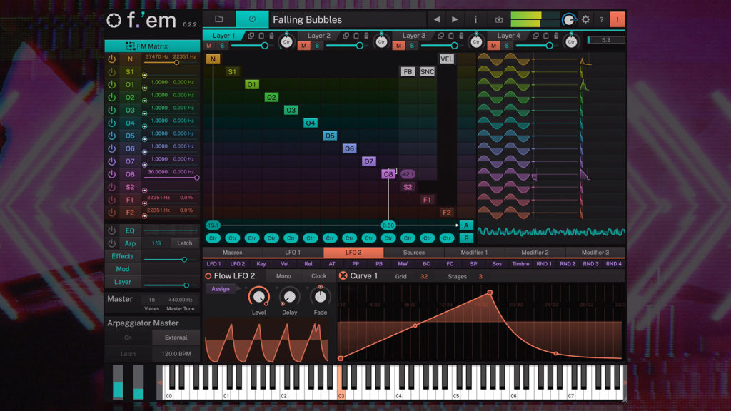 Tracktion Corporation se complace en presentar f.’em. Con ocho osciladores de onda sincronizables, dos operadores de muestra y una matriz de modulación profunda, es uno de los sintetizadores FM más potentes y versátiles jamás fabricados.