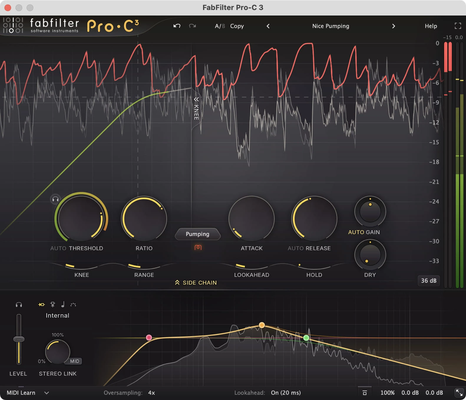 La capacidad de filtrar y ecualizar con precisión la entrada sidechain es fundamental para cualquier gran compresor y Pro-C 3 amplía el número de bandas de ecualización disponibles de tres a seis. Cada banda se puede configurar con cualquiera de las formas de filtro que los usuarios ya conocen y aprecian de Pro-Q 4. El amplio menú de pendientes de atenuación ahora incluye opciones Brickwall de paso bajo y paso alto, y cada banda puede conmutarse independientemente a procesamiento medio o lateral. Con su ecualizador de cadena lateral drásticamente mejorado, Pro-C 3 ofrece más control que nunca sobre la activación de la compresión.
