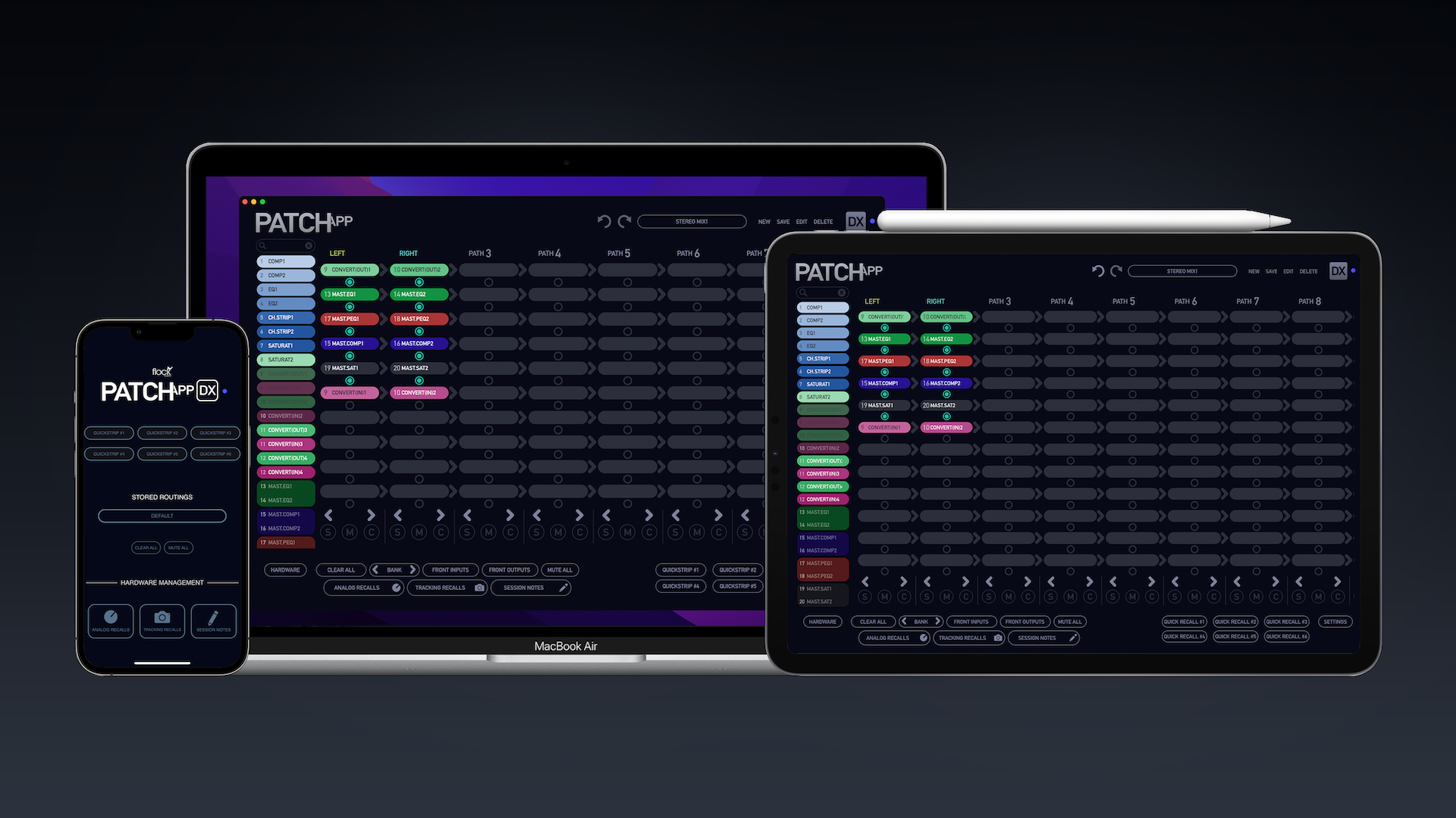 Además de ser compatible con MAC OSX (Windows estarádisponible en el cuarto trimestre de 2022), PATCH APP DX agrega una versión completa de la aplicación para iPad y un control remoto selectivo para iPhone, lo que permite a los usuarios administrar su hardware de la serie PATCH sin estar conectado a sus estaciones de trabajo por primera vez. La integración de la red dentro del ecosistema de la PATCH APP garantiza que cualquier cambio en las rutas, los presets o la configuración se reflejen instantáneamente en todos los dispositivos de un usuario.