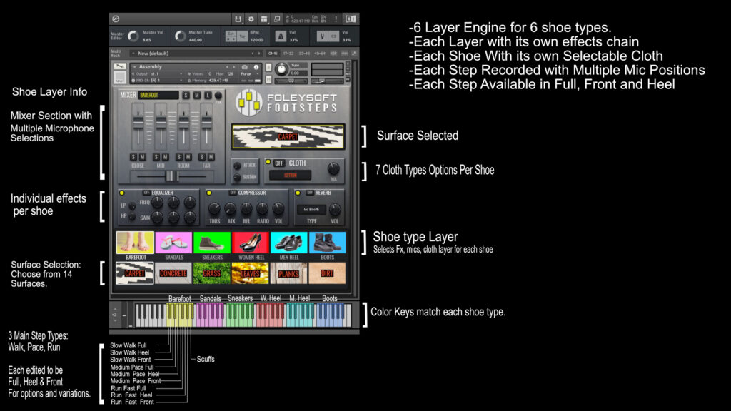 Debidamente desarrollado por profesionales de posproducción de Los Ángeles, muy familiarizados con el trabajo en la industria de la televisión con plazos ajustados para grandes cadenas como Disney, Fox, Sony y Universal, y aún así se fijan un listón alto para crear un trabajo de calidad. Con experiencia en el uso de foley personalizado en samplers, Foleysoft Footsteps tiene algunos trucos bajo la manga para ofrecer una variedad de opciones a los usuarios cuando se trata de crear foley realista. Por ejemplo, al proporcionar opciones de activación separadas para usar la muestra frontal por separado de la muestra del talón de cada paso, si es necesario, se permite una mayor variedad y opciones que no solo se traducen en realismo (por ejemplo, si un actor camina lejos y un paso adelante muestra más la muestra del paso del talón no suena realista, entonces usar solo la muestra del paso del talón a veces puede acercarse a crear un sonido que coincida con el entorno percibido por el actor, pero también le da a Foleysoft Footsteps una ventaja competitiva.