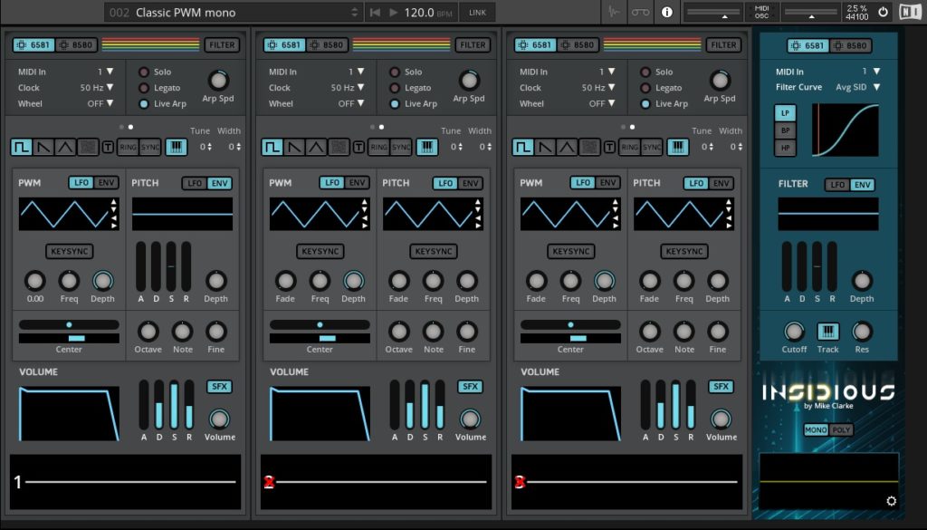 El sintetizador está alimentado por tres osciladores independientes, cada uno con múltiples formas de onda, LFO, envolventes y por supuesto, un secuenciador que se puede usar para crear arpegios y secuencias icónicas por los que este chip es conocido. El filtro también tiene muchas opciones, incluidos múltiples modelos, modos y curvas, con toda la calidez y distorsión del hardware original.