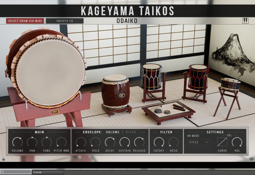 La biblioteca se presenta con una hermosa interfaz, tres posiciones de micrófono distintas y Console, el mixer y rack de efectos característicos de Impact Soundworks, lo que permite a los compositores esculpir el sonido taiko de sutil, grandilocuente a muy modulado.