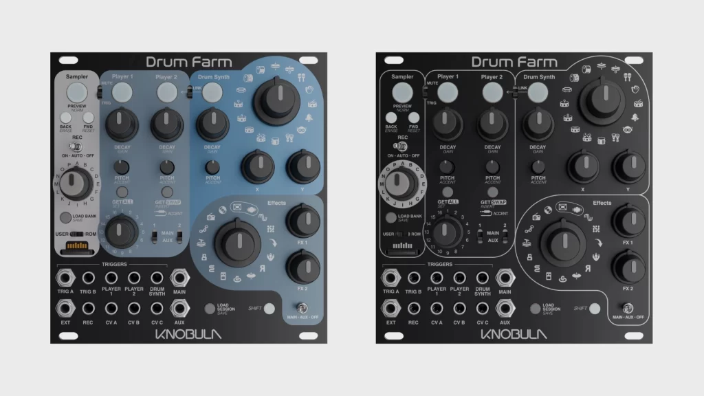 Como su nombre lo indica, Drum Farm se inspira en la experiencia de Jason Mayo, director técnico de Knobula, en animación por computadora, donde vastas granjas de renderizado generaban miles de imágenes realistas con una mínima intervención humana. Como módulo de batería Eurorack orientado al rendimiento, que ocupa 24HP de espacio en rack, se organiza en tres secciones principales: un sintetizador de batería con 16 algoritmos de batería virtuales, analógicos y modelados físicamente; un motor de efectos que ofrece 16 procesos diferentes en tiempo real y un sampler digital con hasta tres voces de reproducción, que captura la salida combinada de todo lo que un usuario creativo pueda imaginar. Al reunir todos los componentes esenciales, Drum Farm permite crear sonidos originales de forma rápida e intuitiva, ya sea dando forma a bombos contundentes, cajas con capas, loops de percusión afinados, platillos, muestras controladas por CV/Gate o membranas de batería modeladas físicamente.