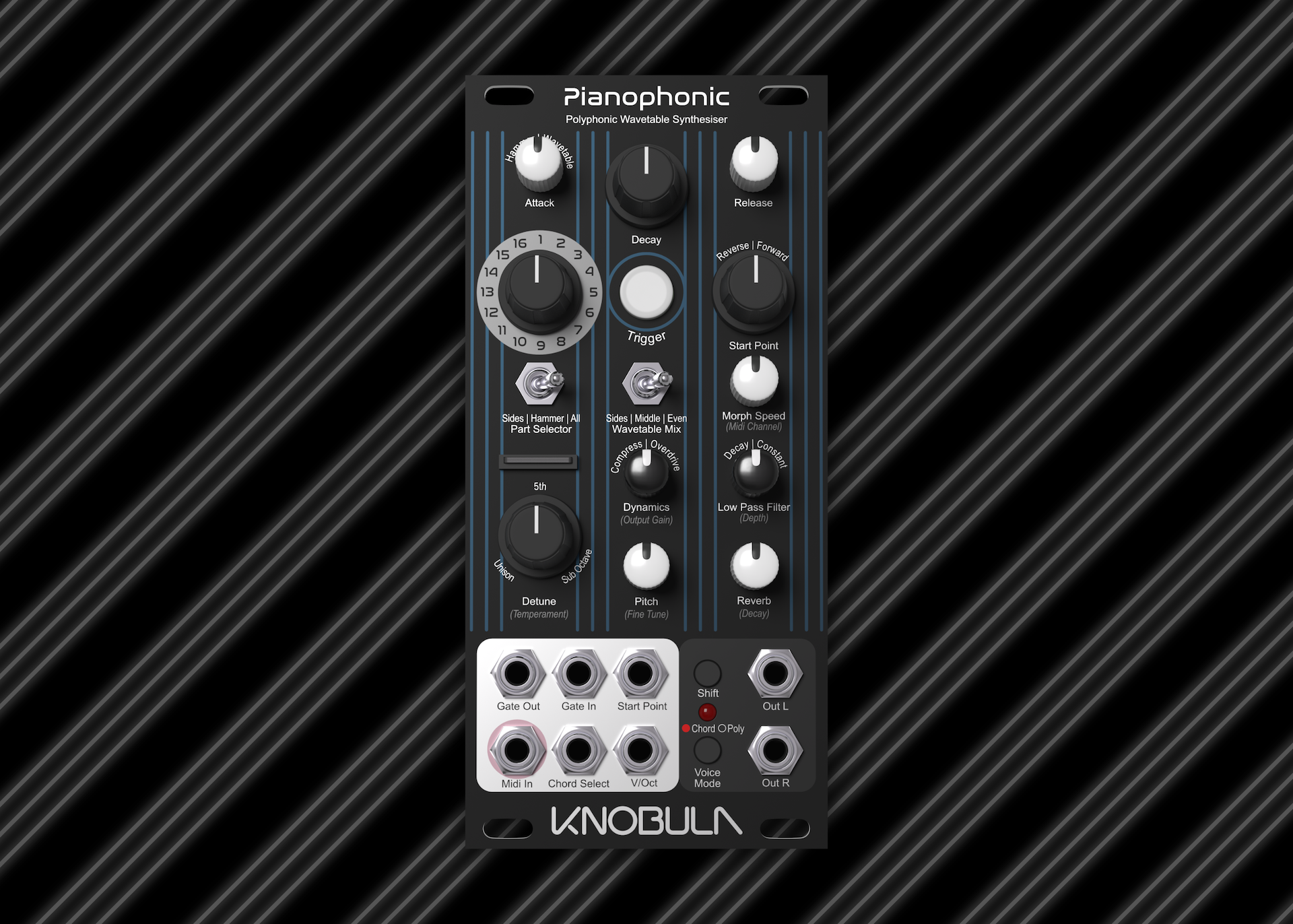 Con su muestreo de 24 bits / 48 kHz y una paleta de sonidos altamente flexible y elástica, Pianophonic sigue la filosofía de Knobula de crear módulos enfocados pero altamente innovadores que cuentan con control de ‘perilla por función’ para los parámetros que realmente importan en una actuación en vivo o en el estudio. Con su conectividad MIDI, E/S de puerta, selección de acordes y entradas de voltios por octava, Pianophonic también está diseñado para ser totalmente pacheable con un Eurorack más grande o una configuración de sintetizador tradicional.