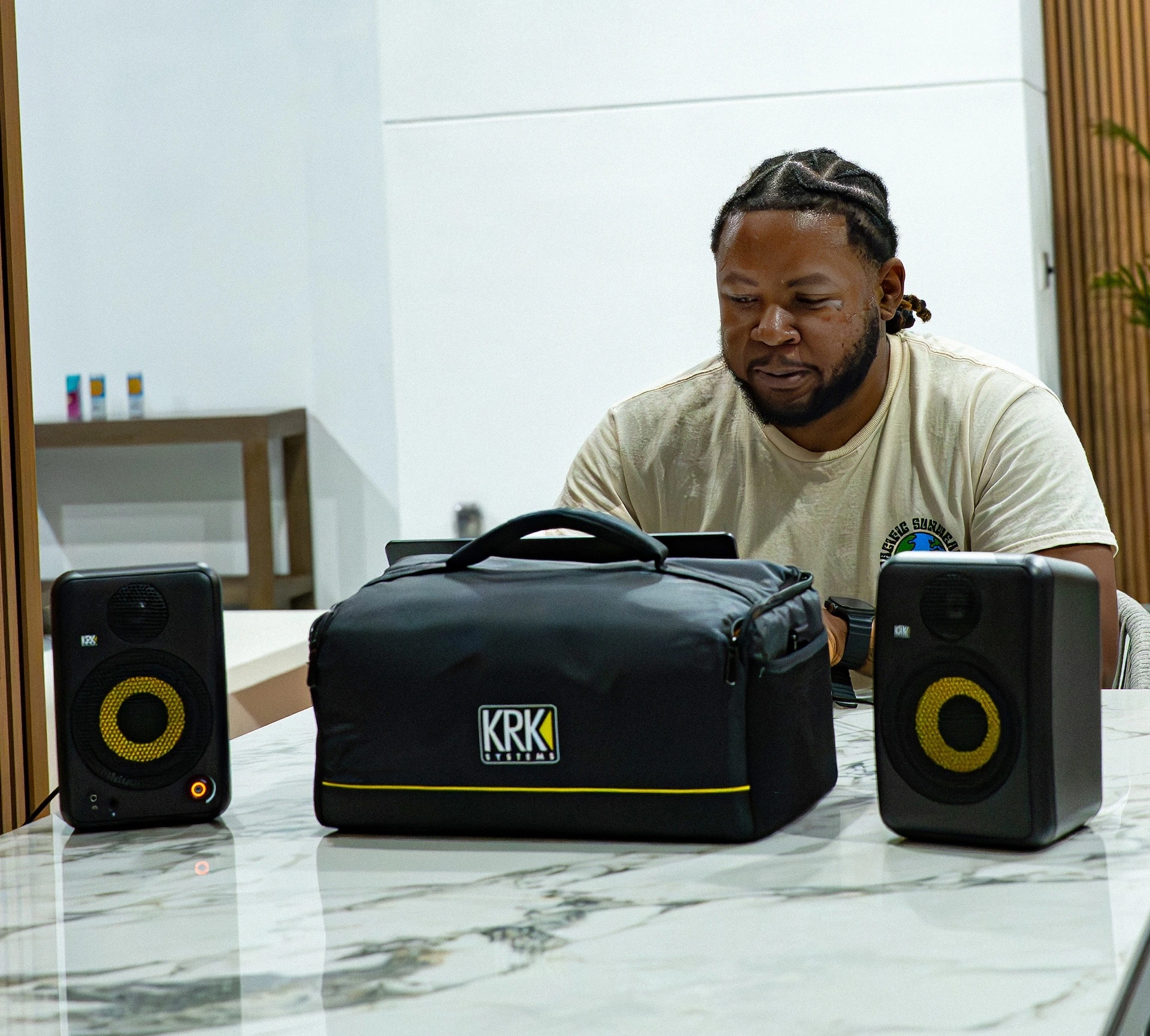 Desde sesiones improvisadas de creación de ritmos hasta la creación de mezclas, Johnny G aprecia la flexibilidad y la excelente calidad de audio que KRK aporta a su flujo de trabajo creativo. “Uso los GoAux principalmente para sesiones de mezcla en casa”, explica. “Instalo los monitores y creo ritmos desde cualquier lugar: la cocina, el balcón, donde sea”.