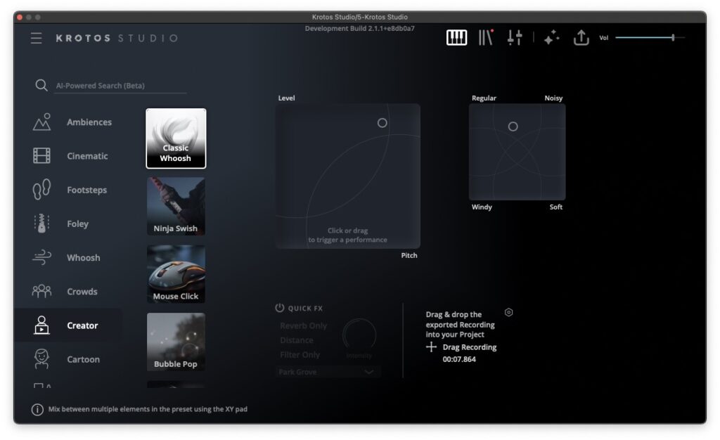 Creator Toolkit aprovecha el flujo de trabajo performativo de Krotos Studio para permitir a los usuarios crear efectos de sonido únicos y atractivos en segundos. Estos presets ejecutables simplifican el proceso de creación de transiciones potentes, efectos de cámara táctiles y señales de sonido distintivas como pings, dings y mucho más. Al ofrecer controles intuitivos y personalización en tiempo real, Creator Toolkit elimina la necesidad de realizar búsquedas en la biblioteca que consumen mucho tiempo, lo que permite a los creadores concentrarse en diseñar sonidos que eleven su contenido.