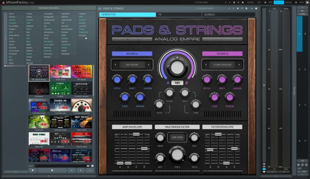 MeldaProduction anuncia la disponibilidad de Analog Empire: Pads & Strings, la entrada inaugural en su serie Analog Empire de instrumentos premium para MSoundFactory. Los usuarios podrán elegir entre 32 sonidos de cuerdas y pads cuidadosamente elaborados con calidez y profundidad gracias a muestras múltiples de alta calidad capturadas meticulosamente en varias notas por octava con cinco capas de velocidad para garantizar una ejecución expresiva y dinámica que realmente captura la magia del sonido analógico.