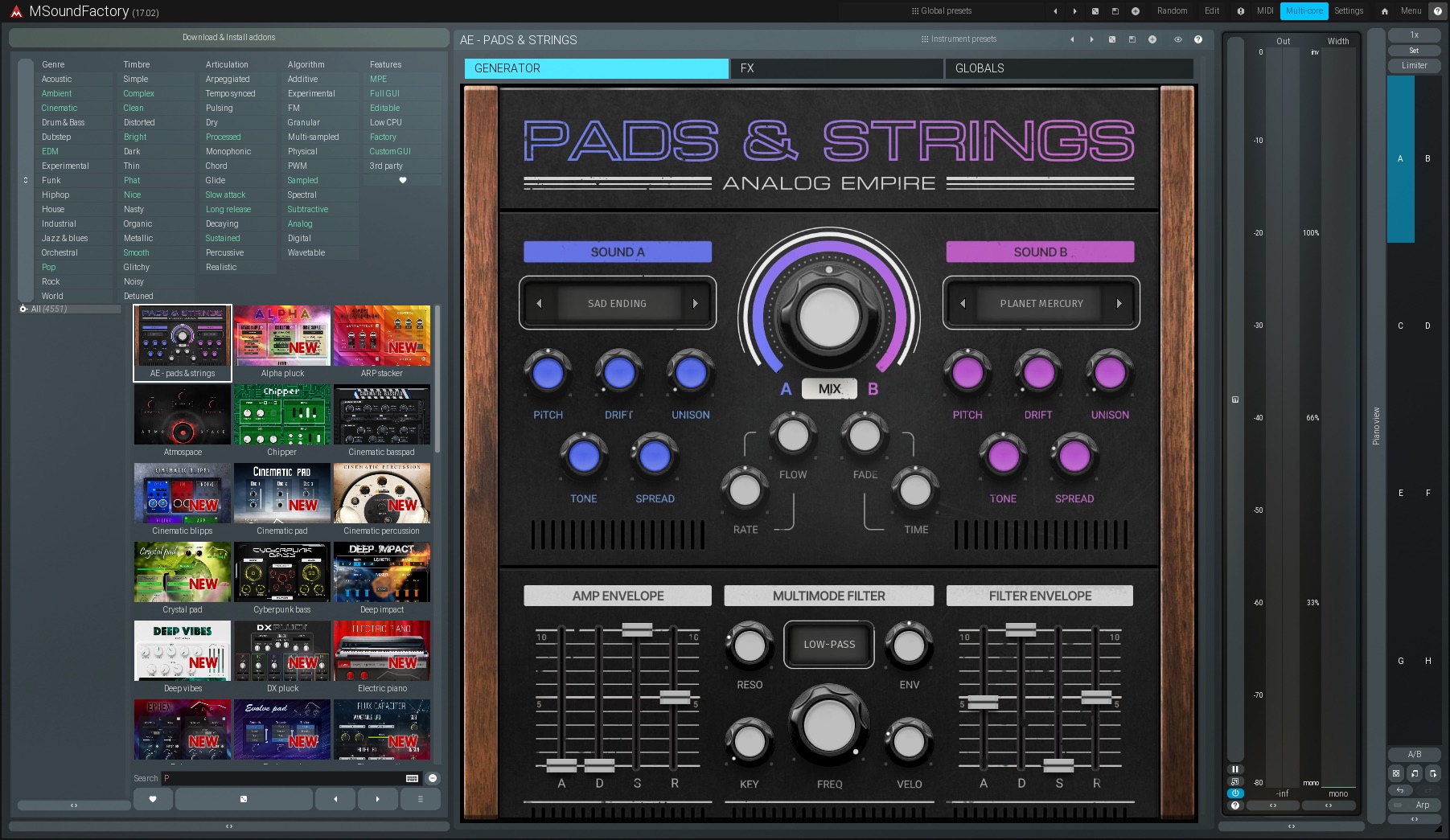 El instrumento premium Analog Empire: Pads & Strings compatible con MPE de MeldaProduction para su plataforma de instrumentos virtuales modulares MSoundFactory tiene como objetivo ofrecer sonidos expresivos de muy alta calidad que son un placer de tocar. Digámoslo de esta manera: su diseño intuitivo garantiza que los usuarios pasen menos tiempo ajustando y más tiempo creando, lo que hace que sea simple y rápido obtener un sonido que se adapte perfectamente a su pista. Es justo decir que Analog Empire: Pads & Strings proporciona las herramientas y los sonidos para elevar la música de cualquiera, ya sea creando paisajes sonoros ambientales, texturas cinematográficas o pads exuberantes.