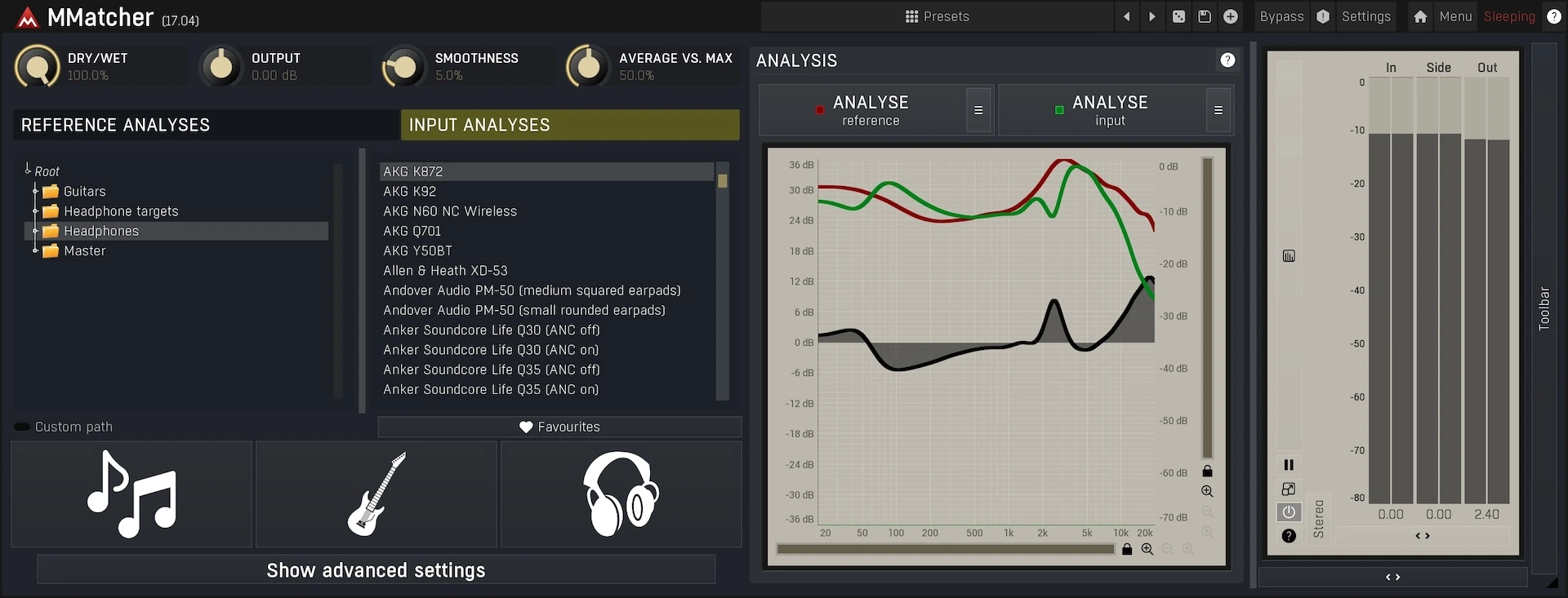 MMatcher de MeldaProduction puede comparar prácticamente cualquier cosa con cualquier cosa, no solo masters. Para lograr mezclas consistentes y fiables mediante la corrección de las respuestas de los auriculares, basta con seleccionar el modelo de auriculares utilizado de la base de datos interna (o analizar cualquier otro) para, por ejemplo, corregir la respuesta del espectro. También permite calibrar los monitores de estudio mediante la creación de perfiles de corrección personalizados basados en el análisis de las mediciones del micrófono, lo que mejora la precisión y la neutralidad, lo que a su vez permite tomar mejores decisiones de mezcla. Y por si fuera poco, MMatcher ofrece una base de datos especializada de sonidos secos de guitarras y bajos eléctricos, creada mediante el análisis de muestras de cientos de guitarras enviadas por la comunidad MeldaProduction. Esto permite a los usuarios de MMatcher experimentar y refinar fácilmente los tonos de sus instrumentos. El plugin simplifica el proceso de lograr los tonos de guitarra y bajo deseados analizando la entrada de sonido de la guitarra y comparándola con esas referencias, lo que representa un campo de juego creativo tanto para bajistas como para guitarristas. Por ejemplo, ¡es perfectamente posible hacer que un Fender Jazz Bass suene como un Sterling StingRay en cuestión de segundos!