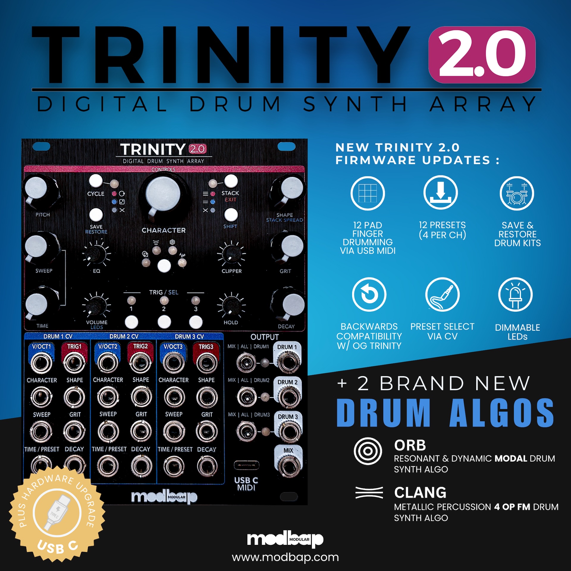 Las fuerzas pioneras de Modbap Modular anuncion el debut de Trinity 2.0, la última evolución de su matriz de sintetizadores de batería digital. Trinity 2.0 promete superar los límites de la síntesis modular con características innovadoras, que incluyen conectividad USB-C y mejoras avanzadas de firmware diseñadas para la exploración creativa en el estudio y la interpretación en vivo.
