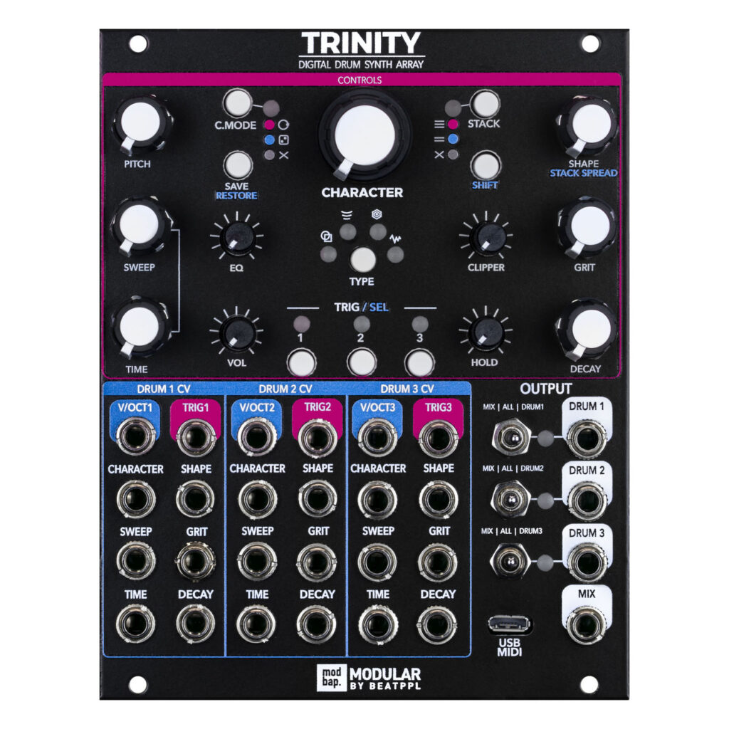 “Trinity ha evolucionado con el tiempo para convertirse en lo que es hoy”. El fundador, propietario y diseñador de Modbap Modular, Corry Banks, está perfectamente posicionado para presentar a Trinity a las masas musicales, destacando históricamente su interesante viaje para llegar allí de la siguiente manera: “Quería un módulo de batería que me permitiera tener un bombo, un tambor y hi-hat en un módulo, de forma simple pero impactante. También quería tocar fuera de esa simplicidad con síntesis de percusión maleable. Trinity tenía que tener un grado de control práctico, junto con una buena cantidad de control CV y/o MIDI. También me meto en el diseño de sonido, así que Trinity tenía que servirme bien en esa área y no me decepciona. Trinity es todo eso, al tiempo que encuentra una manera de presentar algunas peculiaridades interesantes y divertidas también”.