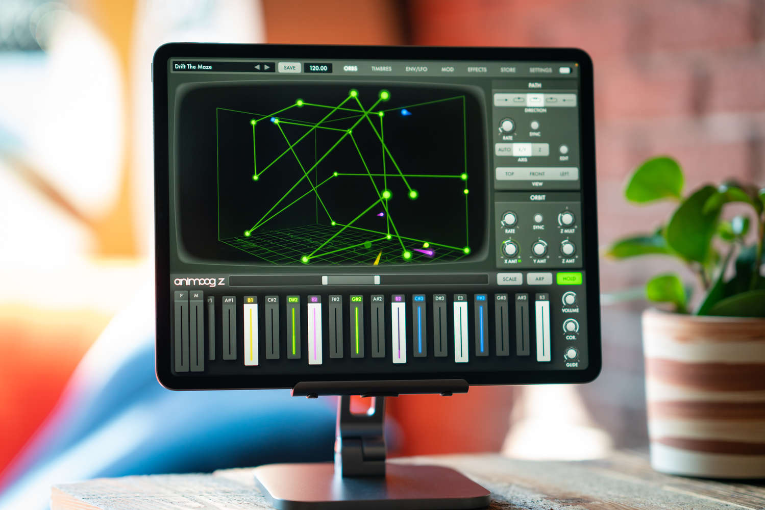 Comenzar con este divertido y expresivo sintetizador polifónico de 16 voces es inmediato e intuitivo: simplemente seleccione y arrastre la ruta de la órbita para crear infinitas configuraciones sónicas a medida que su parche viaja a través de una variedad de timbres. Experimente con efectos dinámicos, cree sus propios timbres y descubra nuevos conceptos de diseño de sonidos multidimensionales. Utilice el teclado configurable incorporado de Animoog Z para controlar el tono y la presión por voz (o enviar salida MIDI) o conecte su controlador MPE favorito para explorar el motor de sonido compatible con MPE de Animoog Z.