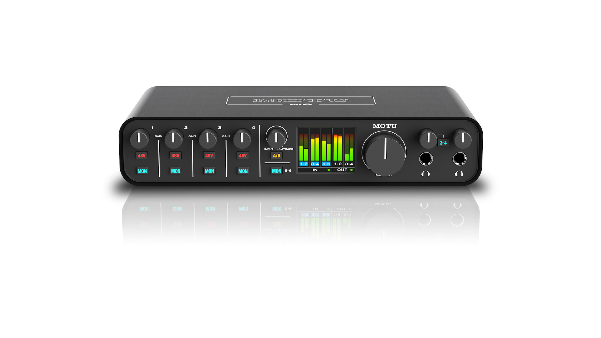 La M6 también cuenta con un interruptor de monitor A/B, único en su clase, para comparar la salida de mezcla en dos conjuntos de monitores de estudio. Impulsadas por la tecnología DAC ESS Sabre32 Ultra™, ambas salidas de auriculares reflejan la señal en las salidas de monitor 1-2 y cuentan con un control de volumen independiente. La segunda salida de auriculares incluye un interruptor 3-4 que le permite monitorear de forma independiente las salidas de línea 3-4, lo que puede proporcionar una mezcla completamente separada de la computadora.