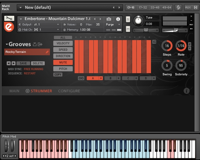 La última opción y tal vez mas motivadora, es el Strummer; un arpegiador con muchísimos presets, tanto para acordes como para notas separadas. Para poder usarlo, nos dirigimos a la pestaña Strummer y activamos el botón de encendido. Algo para destacar es que cada preset se puede modificar de la forma que querramos, con gran variedad de opciones y luego, tenemos la posibilidad de guardarlo. Las opciones para crear un nuevo patrón son prácticamente infinitas y no solo eso, sino que también en cada uno se puede modificar el pitch, velocity, dinámica, etc. Cada patrón puede ser de un compás o de cuatro en un loop, combinándolos a nuestro antojo.