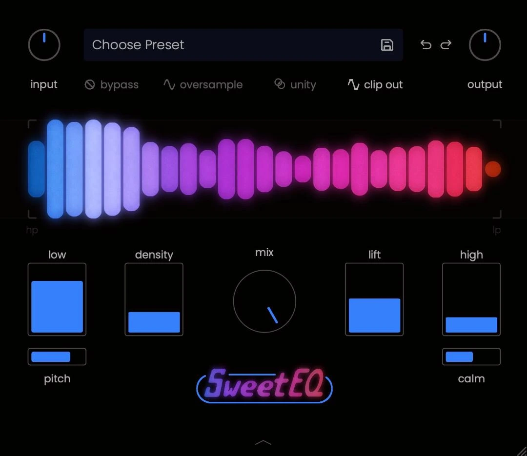 Por último, los controles deslizantes de SweetEQ están orientados al 0-20% inicial de cada efecto, teniendo en cuenta que pequeños cambios en el sonido pueden marcar grandes diferencias. Estos pequeños cambios, en combinación, son similares a lo que varios tipos de equipos analógicos hacen al sonido por defecto. En lugar de modelar un solo equipo, Musik Hack analizó todas las características de una amplia gama de equipos cuyo sonido les gustaba y desarrolló una cadena de señal que pudiera reemplazar cualquiera de ellas.